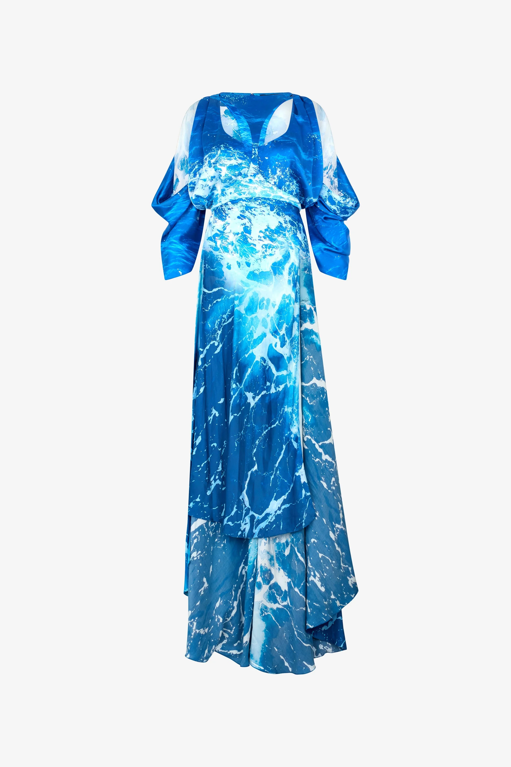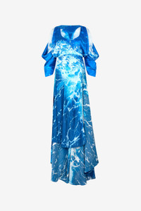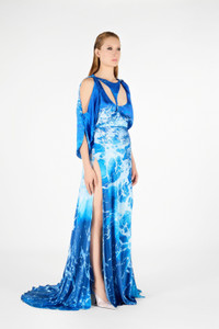 ID: UWT104-RYN94-04927 This long dress with Stretto di Messina print is an ode to art and elegance. The flowing silk caresses the figure, while the print captures the eye with its dynamic beauty. The model is 178 cm tall and wears size S / 40. Details - Exclusive Stretto di Messina print. - Elegant and sophisticated design. - Ideal for special events and gala evenings. - Made in: Italy - Perfect to combine with high heels and minimalist accessories. Care & maintenance External fabric:100% Silk