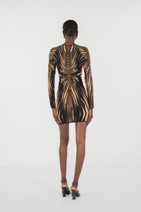 ID: RWM108-MI150-01080 The emblematic Ray of Gold print, one of the cornerstones of Roberto Cavalli’s DNA, refracts over the entire surface of this minidress, while the essential silhouette of the garment takes on character thanks to the two keyhole cut-outs on the front. Details - Minidress with Ray of Gold print - Long sleeves - Rounded neckline - Two keyhole cut-outs on the front Care & maintenance External fabric:83% Viscose / Rayon, 10% Metal - Metallic - Metallised, 7% Polyester