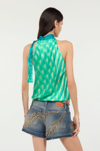 ID: UKT600-RYN47-04000 This Roberto Cavalli top has magnetic charm that turns heads thanks to the iconic all-over Optical Glass print. This pure silk piece features a puffed hem with adjustable ties and a halter neckline complemented by an elegant tie sash. Details - Pure silk top - Optical Glass print - Small Roberto Cavalli signatures - Halterneck - Stand-up collar with tie sash - Adjustable puffed hem with ties Care & maintenance External fabric:100% Silk