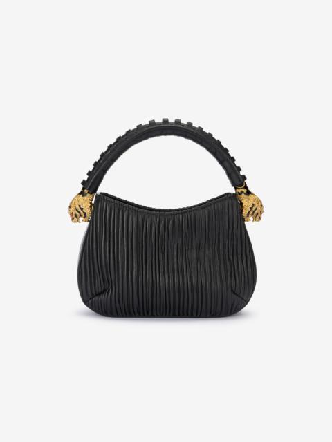 ID: TWB002-PNP03-02000 This hobo bag is crafted from genuine leather with a distinctive engraved effect, and celebrates the DNA of the Roberto Cavalli brand thanks to the two crystal-studded tiger heads decorating the ends of the top handle. Details - Hobo shoulder bag - Top handle with bejeweled tiger heads - Top opening - Printed lining Care & maintenance Leather - Fur:Ovis Aries Aries / Lining:97% Cotton, 3% Elastane