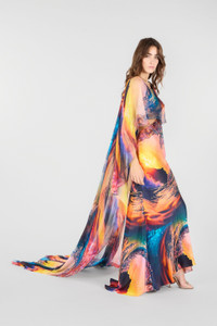 ID: UWT108-RYN98-D2394 This long dress with Itaca Print captures the essence of sophisticated and timeless elegance. The fluid design and integrated cape create a sinuous movement, perfect for special occasions. The model is 178 cm tall and wears size S / 40. Details - Elegant design with integrated cape - Exclusive Itaca print - Ideal for evening events and special occasions - Made in: Italy - Perfect paired with jeweled sandals and clutch - Cut-out design at the waist Care & maintenance External fabric:100% Silk / Secondary fabric:100% Silk