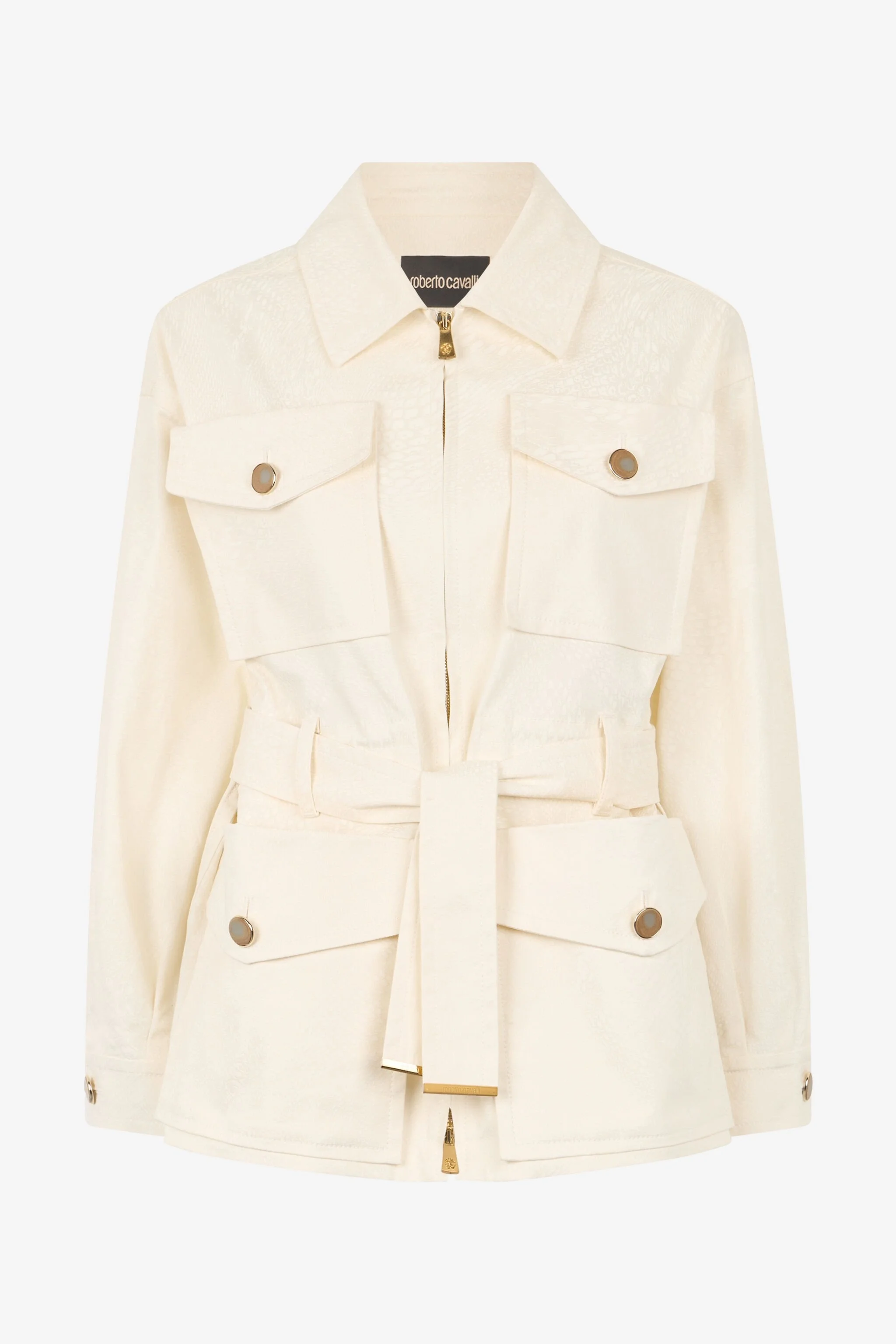 ID: UKT410-4NN53-09088 Innovation and refinement, which have always been hallmarks of the Roberto Cavalli universe, blend perfectly in this Saharan jacket where functional details such as the flap and button pockets, the front zip flap and the waist belt are combined with the touch of wild elegance of the all-over python leather-effect print. Details - Tie waist Safari jacket - All-over tonal python leather-effect print - Four functional pockets with flap and button - Shirt collar - Cuffs with single button - Front zipper fastening - Roberto Cavalli label on the inside collar Care & maintenance External fabric:97% Cotton, 3% Elastane