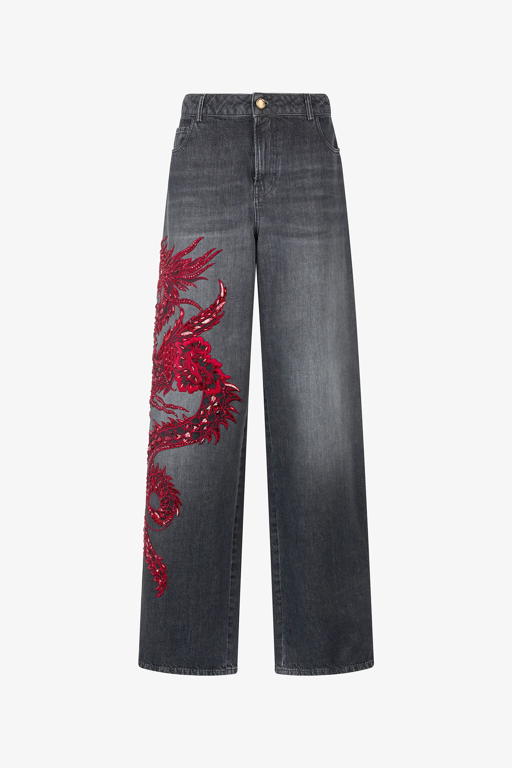 ID: VQJ251-DN001-05051 The reptile universe, one of the Maison's greatest sources of inspiration, is expressed in these pure cotton denim jeans through a legendary kindred creature: a dragon embroidered in a vibrant contrasting tone finished with meticulous sequin workmanship that reproduces its scales. Perfect for adding a touch of boldness to your everyday outfits, the model stands out due to its practical five-pocket design and its slim fit at the waist that widens at the hem. Details - Pure cotton denim jeans - Embroidery on the front finished with sequins - Five-pocket design - Belt loops - Slim fit at the waist and flared hem - Branded tag on back