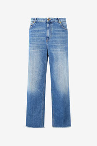 ID: UKJ206-VT008-04564 Jeans, a garment that transcends any trend, have been overhauled by Roberto Cavalli in this wide-leg style made from pure cotton denim with distressed-effect fading. This five-pocket garment features a slightly frayed hem, yet has not done away with the brand’s custom details, represented by the iconic Mirror Snake Monogram embroidered on the back pocket, the tag with lettering on the back and the branded button on the front. Details - Pure cotton denim jeans - Straight, wide leg - Cotton lining - Five-pocket design - Belt loops - Distressed effect - Mirror Snake Monogram embroidered on the back pocket - Tag with lettering on back - Zipper and branded button fastening - Slightly frayed hems Care & maintenance External fabric:100% Cotton / Lining:100% Cotton
