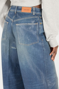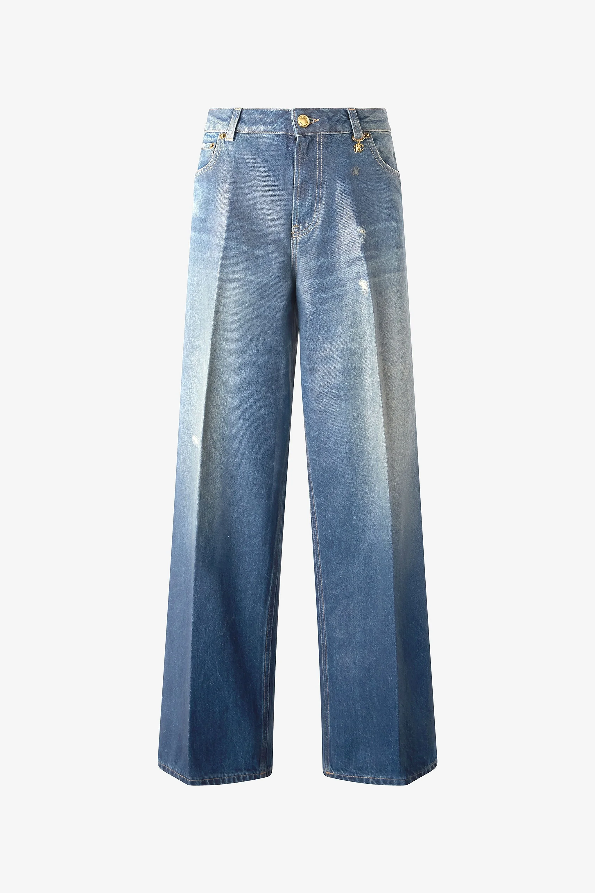 ID: UKJ207-VT006-04564 The timeless charm of jeans is interpreted by Roberto Cavalli in this wide-leg five-pocket model made from pure cotton denim. The distressed effect created by the abrasions and fading on the leg adds a touch of boldness, while the iconic Mirror Snake Monogram in the form of a golden charm stands out on the belt loop to embellish the design. There is no shortage of further custom details, provided by the tag with lettering on the back and the branded button on the front, unmistakable homages to the brand’s DNA. Details - Pure cotton denim jeans - Wide leg - Five-pocket design - Cotton lining - Belt loops - Abrasions and faded detailing - Golden charm with Mirror Snake Monogram on a belt loop - Tag with lettering on back - Zipper and branded button fastening Care & maintenance External fabric:100% Cotton / Lining:100% Cotton