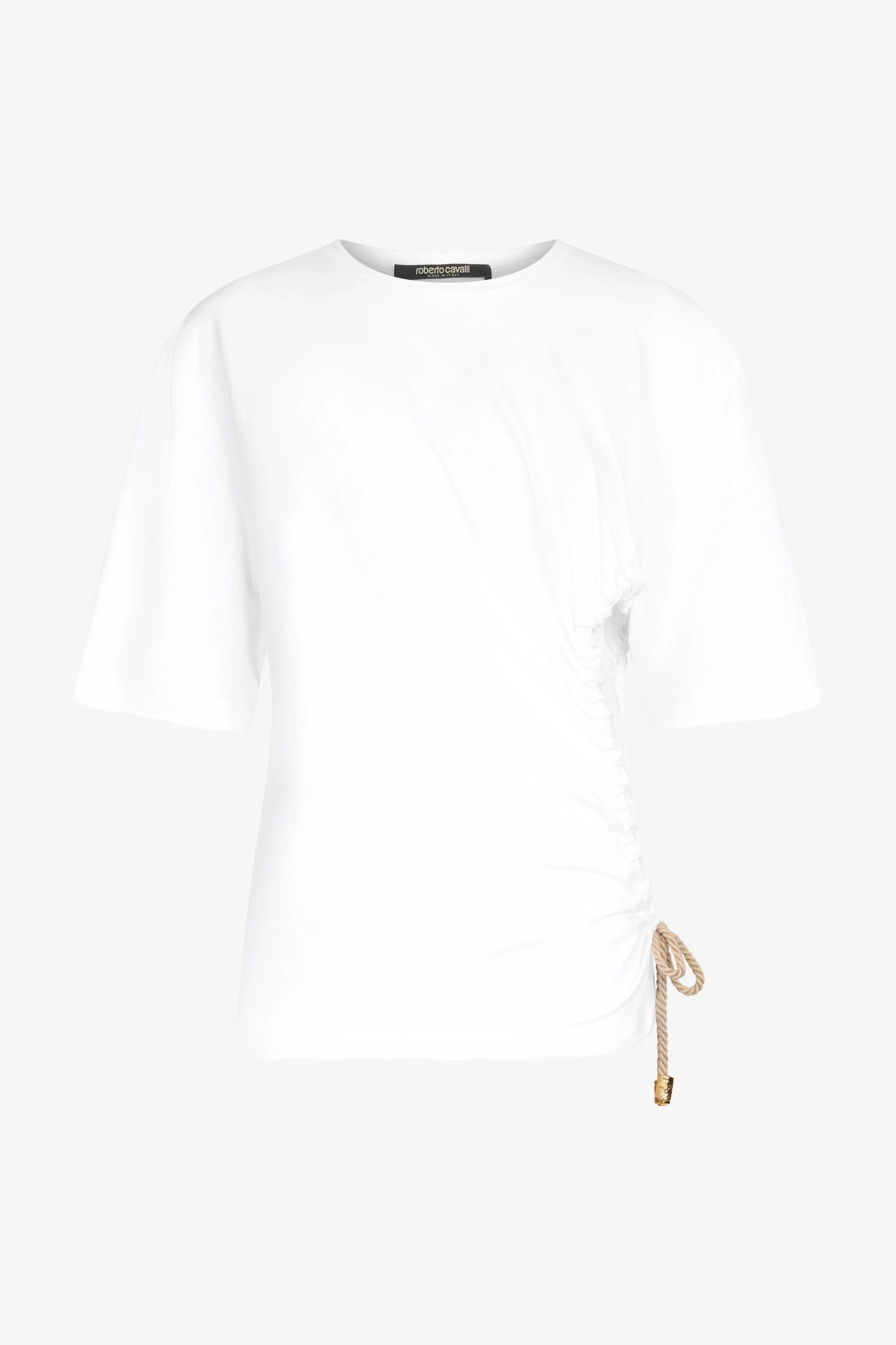 ID: UWT605-JD015-00064 A reinterpretation of a classic basic, this white cotton jersey t-shirt features a decorative side knot that adds an unexpected touch. Perfect for a casual-chic look. The model is 178 cm tall and wears size S / 40. Details - Design with adjustable side knot - Classic crew neck - Short and wide sleeves - Made in: Italy - Ideal with palazzo pants or long skirts - Perfect for creating a layered look with blazers and jackets