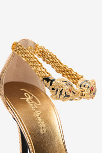 ID: UKS030-PZ579-00047 Synonymous with glamorous and sensual femininity, these sandals are made of fine metallic snake scale-effect leather and are decorated at the ankle with bejeweled chains and crystal-studded tiger heads. The super-high spool heel slims the figure and gives the style even more punch. Details - Leather sandals with snake scale-effect print - Spool heel - Straps with jeweled chains and tiger heads - Zipper fastening on back - Roberto Cavalli signature on the inner sole - Leather sole - RC monogram under the sole - Leather-lined interior - Made in Italy Care & maintenance Lining:100% Capra hircus linneaus / Outer sole:100% Bos Taurus / Upper:100% Bos Taurus