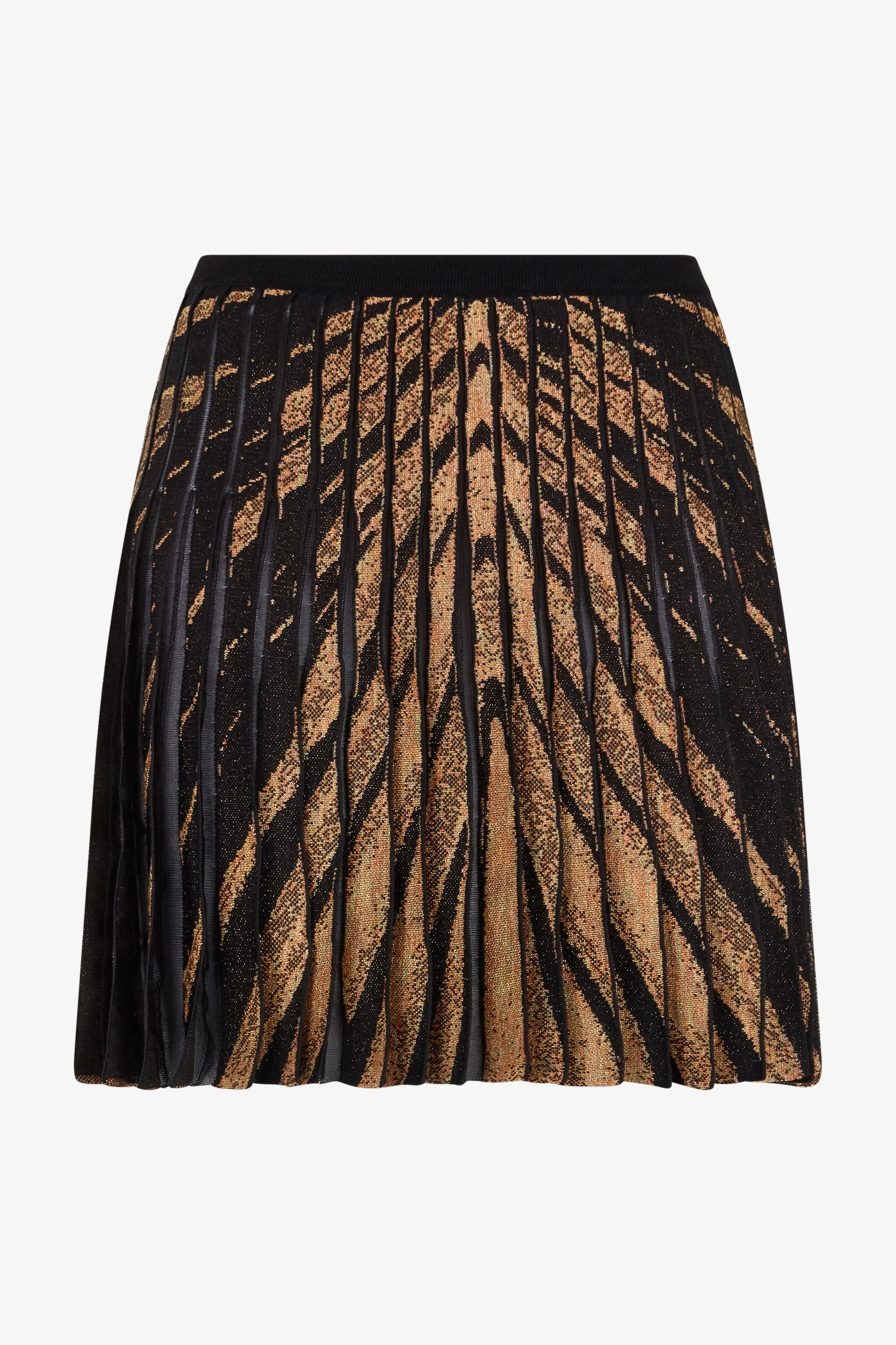 ID: RWM301-MI150-01080 An intriguing Ray of Gold print alternated by a sheer pleated interior brings this pleated knit mini skirt by Roberto Cavalli to life, the perfect combination of femininity and boldness. Details - Knit miniskirt with Ray of Gold print - Pleated design Care & maintenance External fabric:81% Viscose / Rayon, 7% Metal - Metallic - Metallised, 6% Polyester, 6% Polyamide