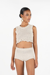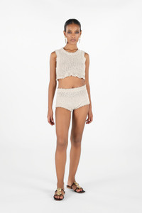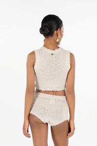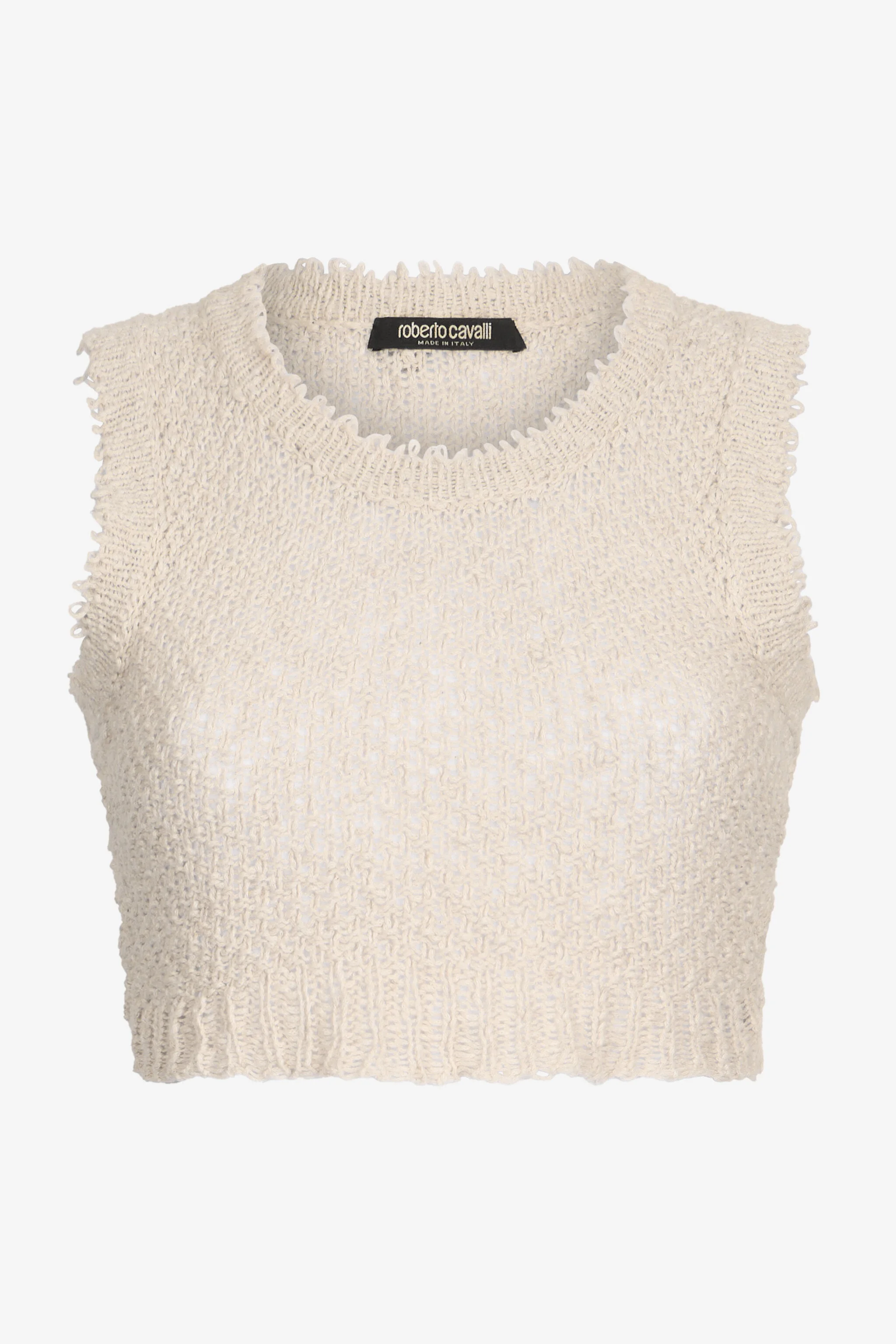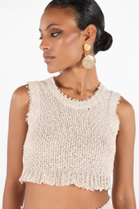 ID: UWM606-ME005-00503 This ivory knit top embodies relaxed elegance, perfect for a sophisticated and comfortable look. The unique texture adds a touch of visual interest, while the sleeveless design makes it ideal for warmer days or layering. The model is 178 cm tall and wears size S / 40. Details - Sleeveless design for maximum freedom of movement. - Unique knit texture adding a distinctive touch. - Comfortable and versatile fit. - Made in: Italy - Ideal for creating layered looks or wearing alone for a casual chic occasion. - Can be paired with high-waisted pants or skirts for a stylish outfit.