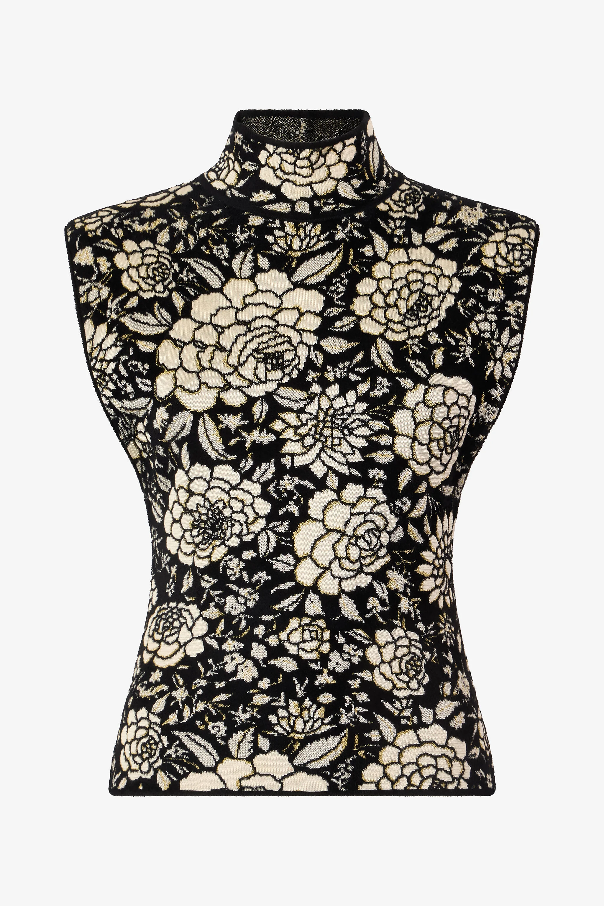 ID: VQM617-MI014-D0477 Distinguished by a refined allure and a close-fitting cut, this knitted top by Roberto Cavalli features a sleeveless design with a high collar and is animated by an elegant contrasting jacquard floral pattern. Details - Knitted top - All-over jacquard floral pattern - Sleeveless design - High neck - Fitted lines