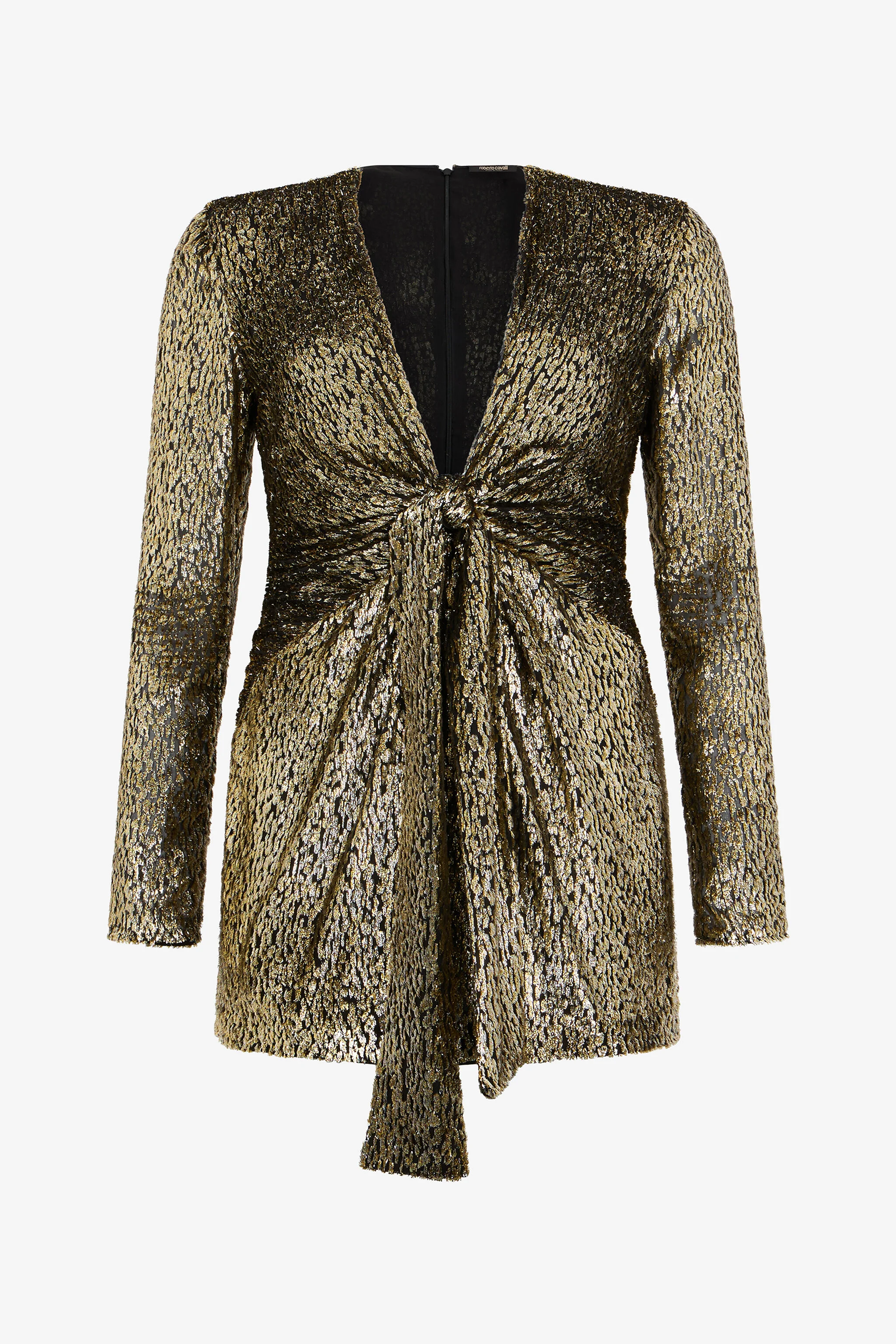 ID: WKT142-FT060-05508 A dress that captures the essence of modern elegance. The Fil Coupe Leopard fabric creates a sophisticated texture, while the enveloping cut flatters the silhouette. The polyester and silk blend adds a touch of timeless luxury. Perfect for those seeking a distinctive and refined piece. Details - Elegant dress with leopard print - Silk blend for a luxurious texture - Figure-hugging, feminine silhouette - Bold yet sophisticated design - Perfect for special occasions