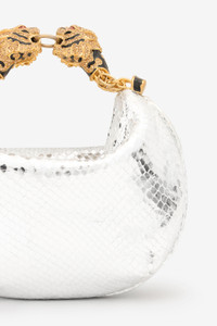 ID: UKB013-PZ579-00106 A mini representation of the Maison’s most captivating stylistic details, this hobo bag is crafted from genuine leather with snake scale-effect embossing and is finished with the signature Roberto Cavalli logo on the front. The small top handle crafted from two fierce tiger heads studded with crystals attests to the constant attention to detail, while the interior lined with the iconic Jaguar Skin print recalls the brand's passion for animal motifs. Details - Snake scale-effect leather hobo bag - Mini size - Roberto Cavalli logo on the front - Top handle formed by bejeweled tiger heads - Can be carried by hand - Top fastening with zipper - Lining with Jaguar Skin print Care & maintenance Leather - Fur:Aegagrus Hircus / Lining:97% Cotton, 3% Elastane