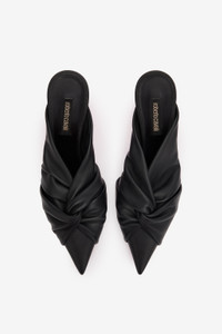 ID: UKS009-PN003-D0667 Emblematic of vibrant elegance in the purest Roberto Cavalli style, these mules with spool heel and bright contrasting sole feature a sharp pointed-toe design and a refined upper in soft leather with knotted effect on the front. The model is further enriched by references to the Maison's universe, such as the signature metallic RC Monogram on the sole accompanied by the unmistakable lettering, which also appears on the insole. Details - Leather mules - Knotted detail on the front - Pointed-toe design - Leather-lined insole with Roberto Cavalli logo - Contrasting leather sole with metallic RC Monogram and Roberto Cavalli logo - Mid-height spool heel - Made in Italy Care & maintenance Lining:100% Capra hircus linneaus / Outer sole:100% Bos Taurus / Upper:100% Ovis Aries Aries