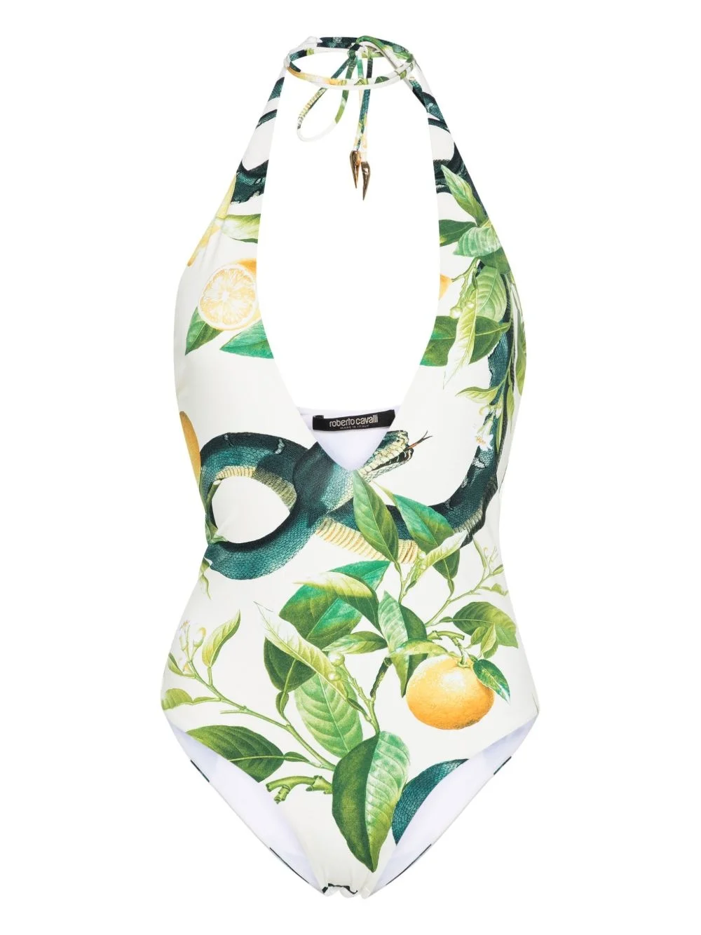 lemon-print one-piece swimsuit Highlights - Beige/multicolour - Stretch-design - Lemon-print - Plunging v-neck - Sleeveless - Halterneck tie fastening - Full lining - Slip-on style - Be mindful to try on swimwear over your own garments. Made in Italy Composition Polyamide 86%, Elastane 14%