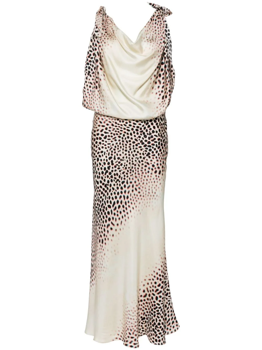 leopard-printed silk dress Highlights - Beige/multicolor - Silk - Satin weave - All-over leopard print - Tie-fastening straps - Cowl neck - Sleeveless - Flared hem - Full-length Made in Italy Composition Silk 100% SIZE & FIT Model measurements Height 5 ft 10 in(1.77 m) Bust/Chest 27.95 in(71 cm) Hips 34.64 in(88 cm) Waist 22.83 in(58 cm) FittingInformation Designed for a loose fit at the chest and waist with a close fit at the hips Made from a lightweight non-stretch fabric