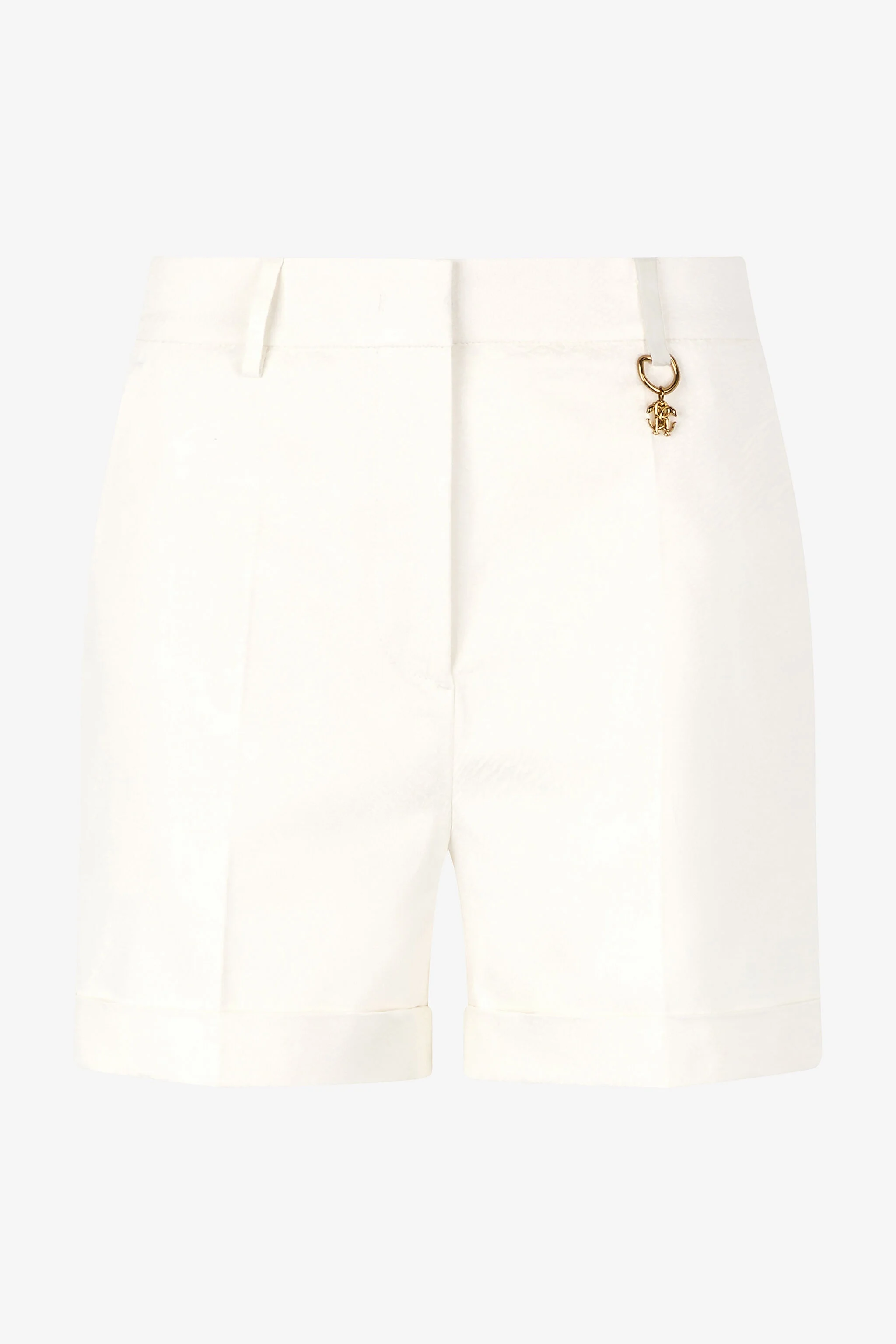 ID: UKT214-4NN53-09088 The wild elegance of the reptilian world, which has always been a source of inspiration for Roberto Cavalli, is fully expressed in these women's shorts featuring a delicate solid-color all-over python leather-effect print and embellished with a gold charm in the shape of the iconic Mirror Snake Monogram on the belt loop. Details - Stretch cotton shorts - Lined - All-over tonal python leather-effect print - Belt loops - Golden charm with Mirror Snake Monogram on a belt loop - One double-welt back pocket Care & maintenance External fabric:97% Cotton, 3% Elastane / Lining:55% Viscose / Rayon, 45% Polybutyleneterephthalate
