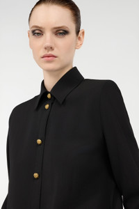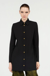 ID: VWT164-WP008-05051 A perfect combination of comfort and elegance, this shirt with a long design by Roberto Cavalli is made of a solid-color wool blend and is embellished with a row of contrasting golden buttons with engraved workmanship. Details - Long wool-blend shirt - Pointed collar - Long sleeves - Golden bejeweled buttons on front - Yoke with box pleat on the back - Roberto Cavalli label on the inside collar