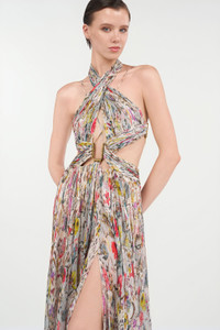 ID: WQT129-CKR29-00551 The lightweight chiffon moves beautifully with every step, while the intricate draping and ethereal allure create a timeless charm. A masterpiece of elegance, perfect for those who want to stand out with grace and style. Details - Captivating floral print that draws the eye - Lightweight chiffon for graceful movement - Draping that enhances its elegance - Fluid, enveloping silhouette - Sophisticated, intricately woven details