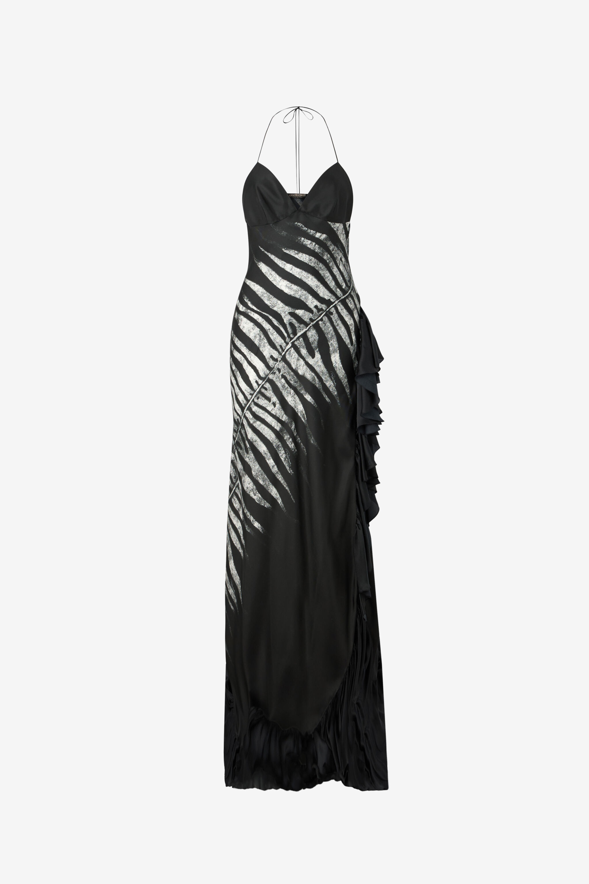 ID: UKT107-4QN50-D0146 The wild elegance once again leaves its mark on the Roberto Cavalli universe with this long pure silk dress embellished on the front and back by a bold Zebra print, while the deep side slit and ruffle hem further enhance the design. Details - Long silk dress with Zebra print - Plunging sweetheart neckline - Sleeveless design with thin straps that tie on the back - Backless - Asymmetrical hem with deep side slit - Flounced hem Care & maintenance External fabric:100% Silk / Secondary fabric:100% Silk