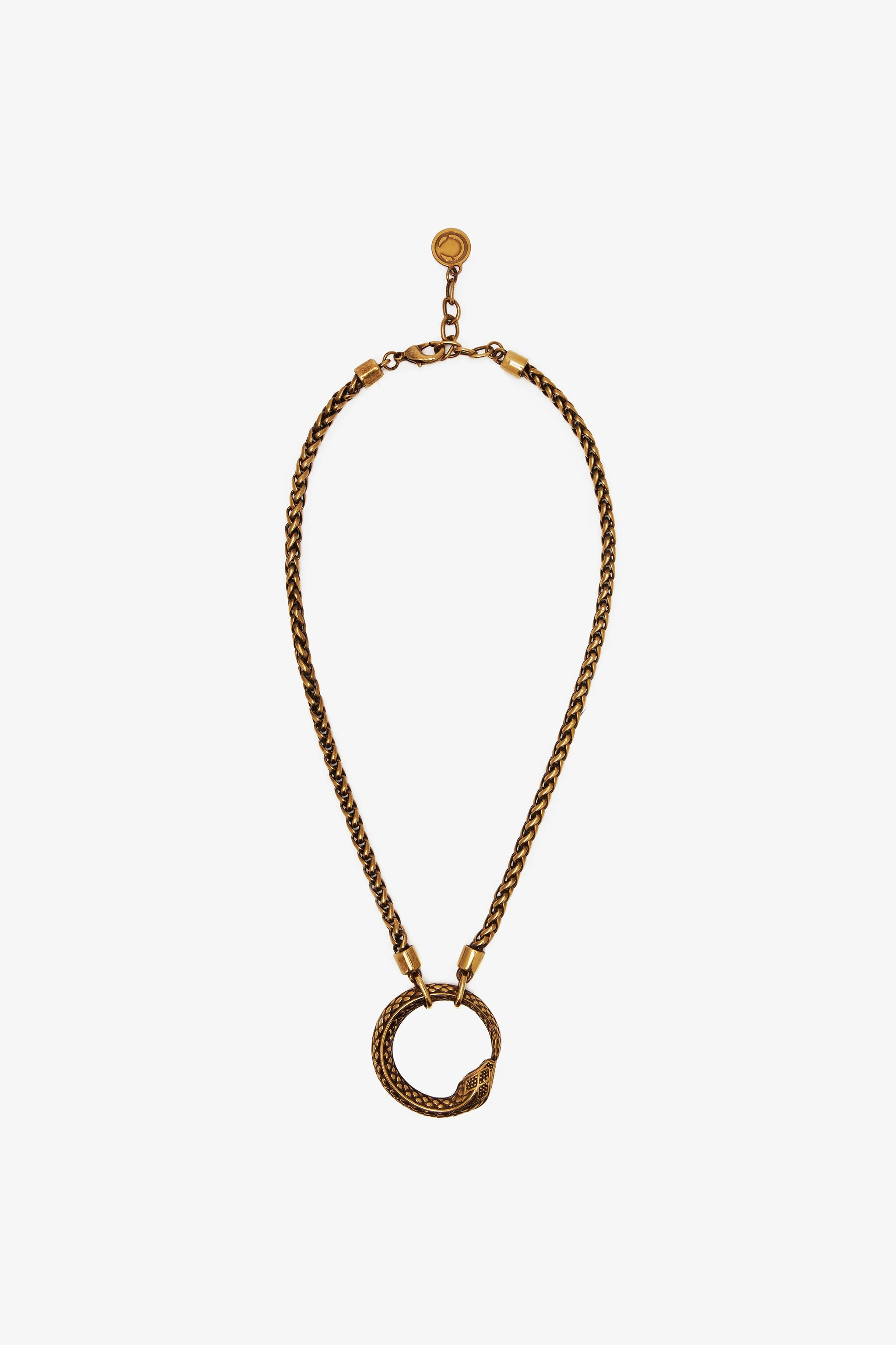 ID: UKG008-AM001-00242 The charm of the snake, a mysterious creature that often features in the Roberto Cavalli universe, is the distinctive feature of this necklace with an exclusive antique gold finish. The accessory features a chain with thin yet dense links, completed by a pendant in which the body of the reptile, embellished with finely crafted scales, joins the head and tail to recreate the shape of a circle. The medallion with the logo, on the other hand, attests to the Maison’s Made in Italy excellence and constant attention to detail. Details - Snake-shaped pendant necklace - Dense, fine-link chain - Scales and embossed details on the outside of the pendant - Antique gold-tone metal - Medallion with Roberto Cavalli logo - Adjustable fastening with clasp - Made in Italy Care & maintenance Composition:Brass