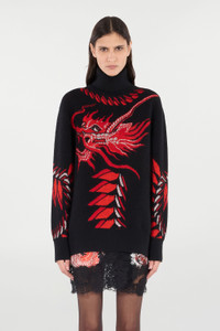 ID: VQM618-MPC02-T0968 Make an authentic style statement with this long sweater by Roberto Cavalli. The model is made of a soft and comfortable stretch wool and cashmere blend, and features an oriental-inspired pattern and a contrasting Chinese dragon. Details - Stretch wool and cashmere-blend sweater - Long design - Contrasting pattern and dragon - High neck - Rib-knit neck, cuffs and hem
