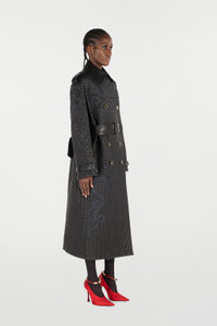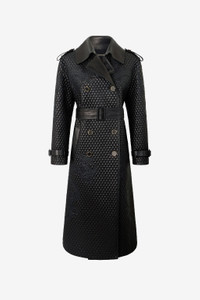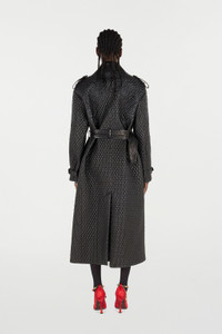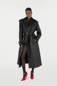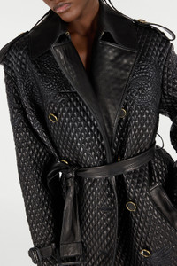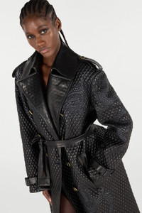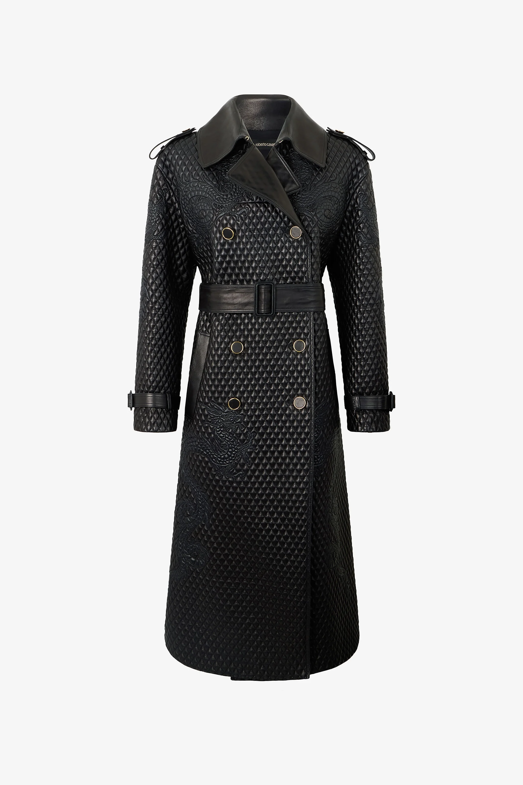 ID: VQP501-PN003-05051 Roberto Cavalli reinvents timeless elegance with this long leather trench coat in which classic details such as adjustment straps, a waist belt and a double-breasted design are combined with an innovative 3D diamond quilting, finished with sinuous dragons. Details - Long leather trench coat - 3D diamond quilting - Topstitched dragons - Long sleeves - Straps with buckles at the wrists - Classic lapels - Buttoned adjustment straps on the shoulders - Two side pockets - Belt with buckle at the waist - Double-breasted fastening with buttons - Roberto Cavalli label on the inside collar