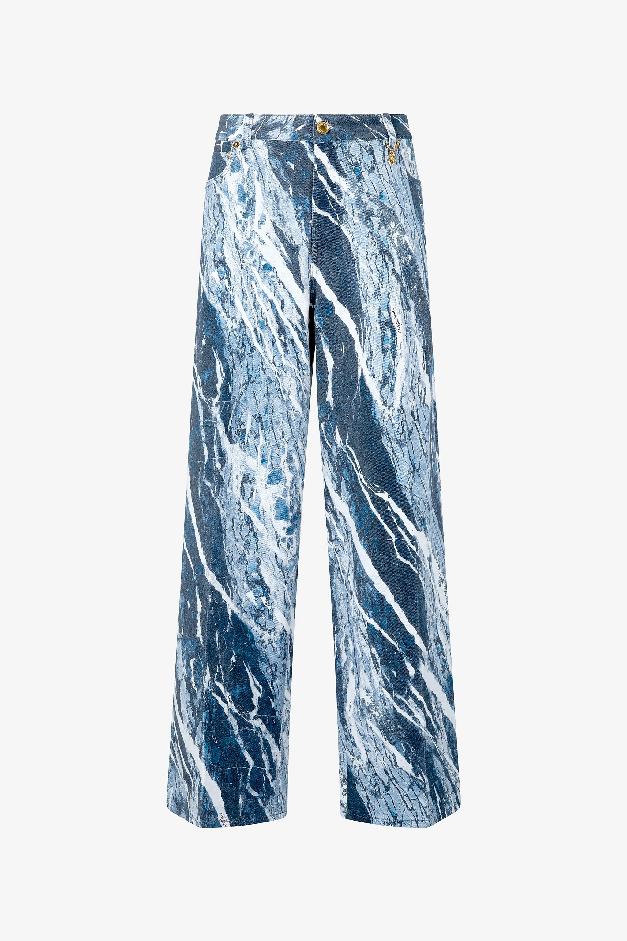ID: UKJ207-DAN22-04964 A new take on the iconic elements of the Roberto Cavalli universe, these palazzo pants are embellished with a vibrant print with a refined all-over marbled effect and a golden charm in the shape of the iconic Mirror Snake Monogram on a belt loop. Details - Stretch cotton pants - Lined - Five-pocket design - Palazzo cut - All-over Marble print - Roberto Cavalli signature - Belt loops - Golden charm with Mirror Snake Monogram on a belt loop - Tag with lettering on back - Front branded button fastening Care & maintenance External fabric:98% Cotton, 2% Elastane / Lining:65% Polyester, 35% Cotton