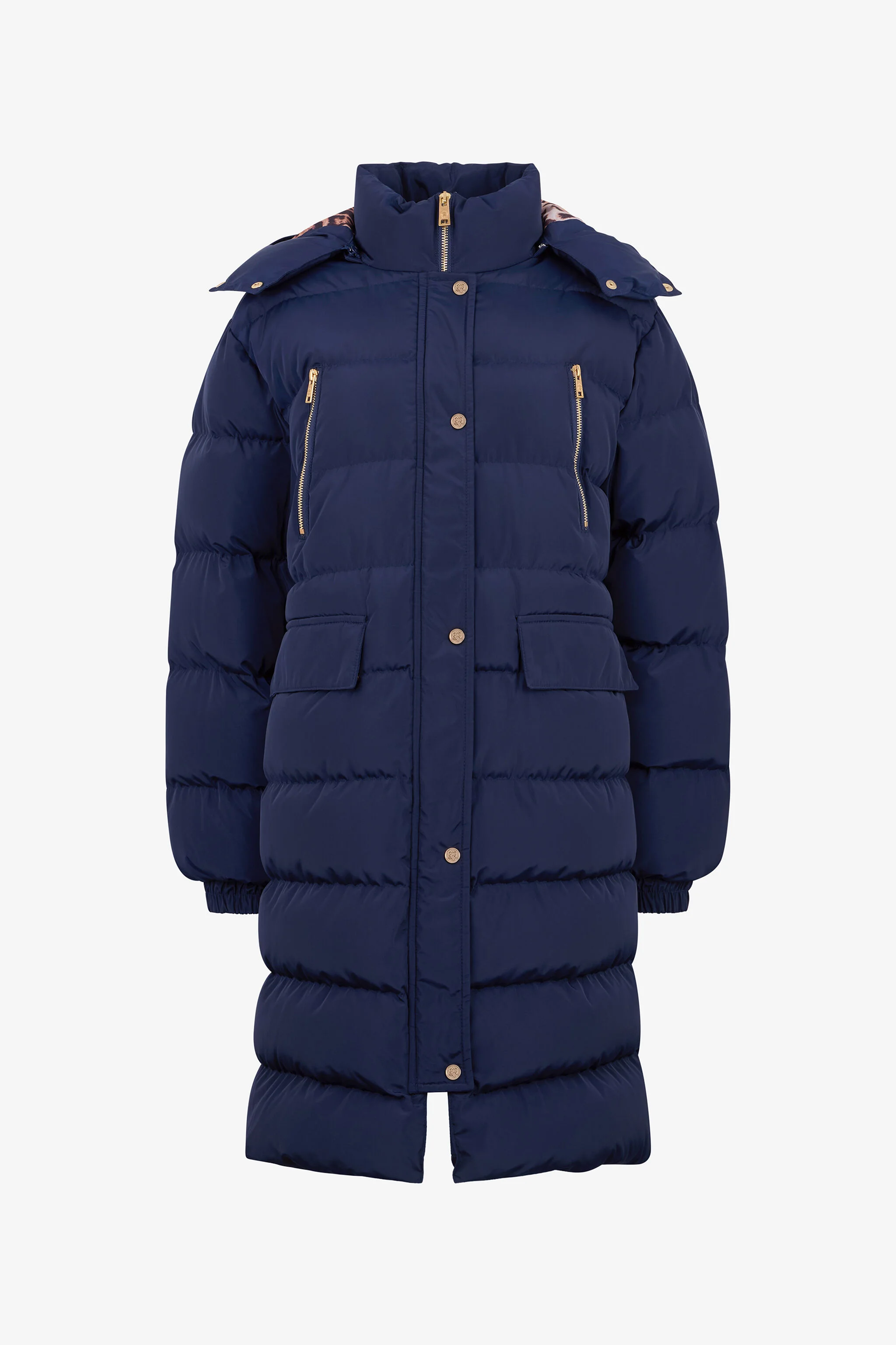 ID: ROT80A-FY035-04964 A masterpiece of urban outerwear, this navy blue down jacket combines enveloping warmth with a surprising secret. The clean, quilted silhouette is accented with gleaming gold hardware, offering a touch of sophisticated glamour. Peek inside the hood to discover the bold Marble print, a signature Cavalli touch that reveals an untamed spirit. This piece is not just a coat, but a statement of duality: classic elegance on the outside, wild artistry within. The model is 178 cm tall and wears size S / 40 IT. Details - Long down jacket in a solid navy blue hue. - Characterised by a quilted design and contrasting gold-tone metal hardware. - Features a detachable hood with an internal Marble print lining. - Central zip and press-stud closure. - Multiple zip pockets and flap pockets for functionality. - An ideal choice for facing the coldest city days with style and warmth. - Pair it with leather trousers and ankle boots for a bold and contemporary winter look. Care & maintenance External fabric:100% Polyester / Padding (Feather):90 Down 10 Duck feather