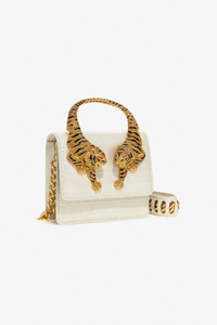 ID: SKB023-PZ975-00533 A shiny texture with crocodile scale-effect embossing and two tigers studded with crystals form the handle: this is how Roberto Cavalli pays tribute to its distinctive style in this leather bag, where the functional edge is provided by the removable, finely crafted chain strap with leather shoulder pad. On the back, the accessory is embellished with the Maison's signature logo. Details - Bag that can be carried as a shoulder bag or handbag - Roberto Cavalli logo on the back - Handle on top formed by bejeweled tigers - Removable gold-tone chain strap with leather shoulder strap - Flap with press-stud - Lined interior - Interior wall pocket with zipper - Inside label with Roberto Cavalli logo - Made in Italy - Measures 18,5x15,5x7,5 cm Care & maintenance Leather - Fur:Bos Taurus / Lining:60% Polyester, 40% Polyurethane