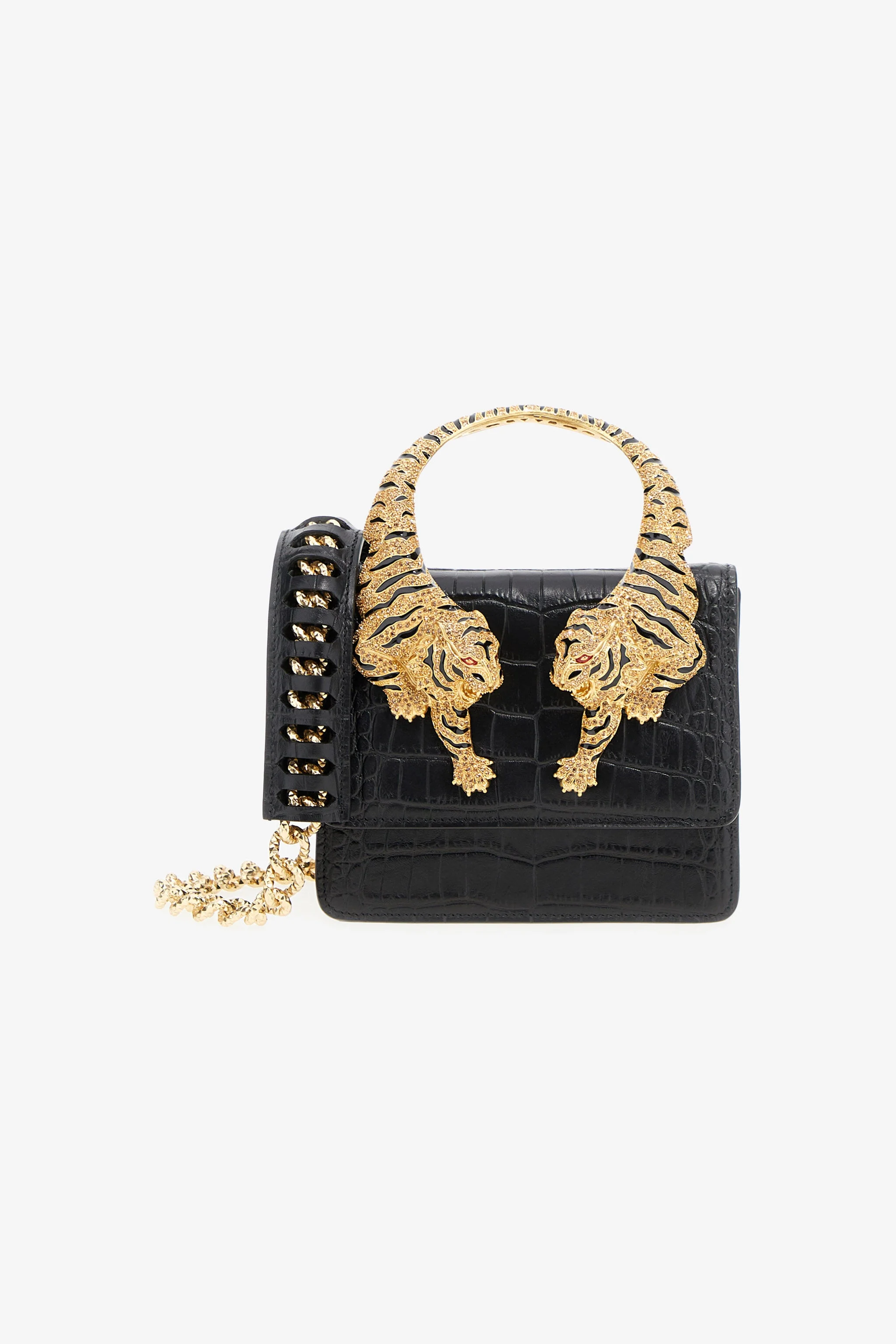 ID: SKB023-PZ975-05051 Details - Hobo Fang Handbag with a raised edge and the addition of two mirrored metallic Feng on the front panel - Antique gold plating - Detachable and adjustable leather shoulder strap - Internal loop with magnetic closure - Demi-rigid construction - Lining with a jaguar print fabric - Made in Italy - Measures 18,5x15,5x7,5 cm Care & maintenance Leather - Fur:Bos Taurus / Lining:60% Polyester, 40% Polyurethane