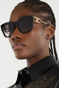 ID: UALD14-ID209-D9889 Wide feminine shape of the front. Acetate front combined with metal temples. The decor of the temples is inspired by the belt buckle Details - Sunglasses Roberto Cavalli - Mirror snake collection - Buckle desing temple - Made in italy - Lenses 52mm Bridge 21mm Temples 125mm - ID: SRC130520700 - ID: SRC130520700 Care & maintenance Composition:Acetato, Polyester, Stainless Steel
