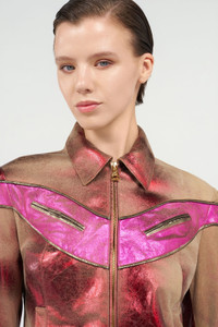 ID: WQP400-PC002-D0032 A modern design masterpiece, this jacket combines the elegance of laminated leather with bold metallic accents. Its structured silhouette and striking color contrasts create a daring, unmistakable look. Perfect for those who love to stand out with style and originality. Details - Metallic details enhance the structure - Bold, distinctive color contrasts - Structured silhouette with a modern design - Laminated leather for a luxurious effect - Classic collar enriched with contemporary touches