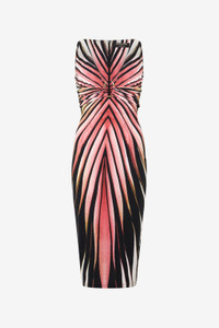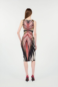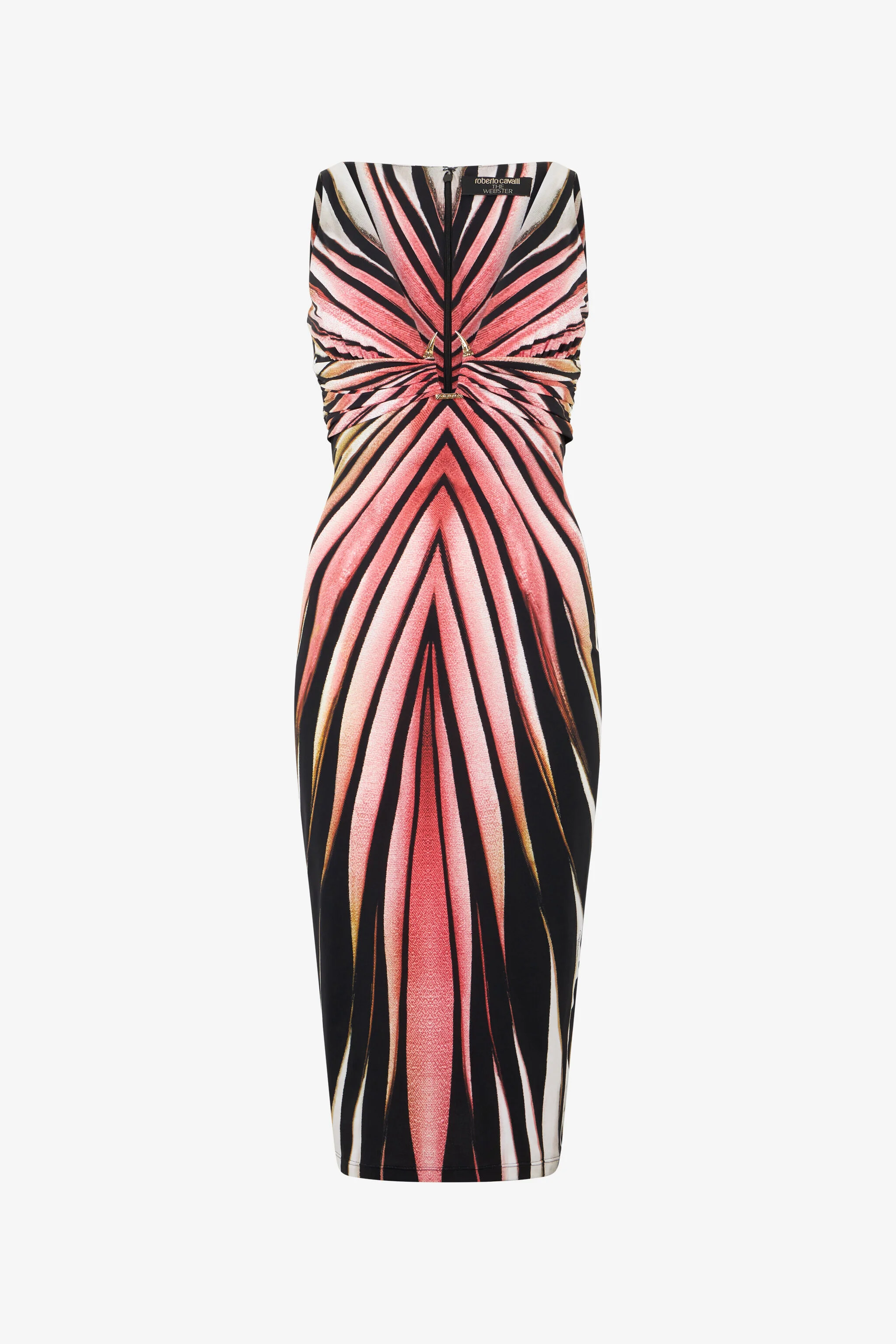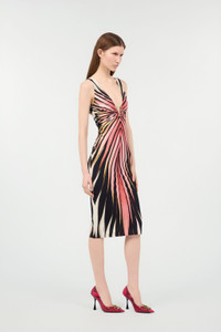 ID: VKT100-LNM33-02500 A warm and hypnotic Ray of Pink print spreads across this dress by Roberto Cavalli, ready to add a touch of luxury to any look. The garment, with its seductive sheath design, features a deep V-neckline that ends with a golden detail with the tiger Fang, a meeting point of two bands that converge on the front creating an elegant gathered effect. Details - Sheath dress - All-over Ray of Pink print - Sleeveless design - Plunging V-neck - Golden detail on the front with Fangs - Zipper fastening on back - Roberto Cavalli The Webster label on the interior Care & maintenance External fabric:86% Polybutylene terephthalate, 14% Elastane
