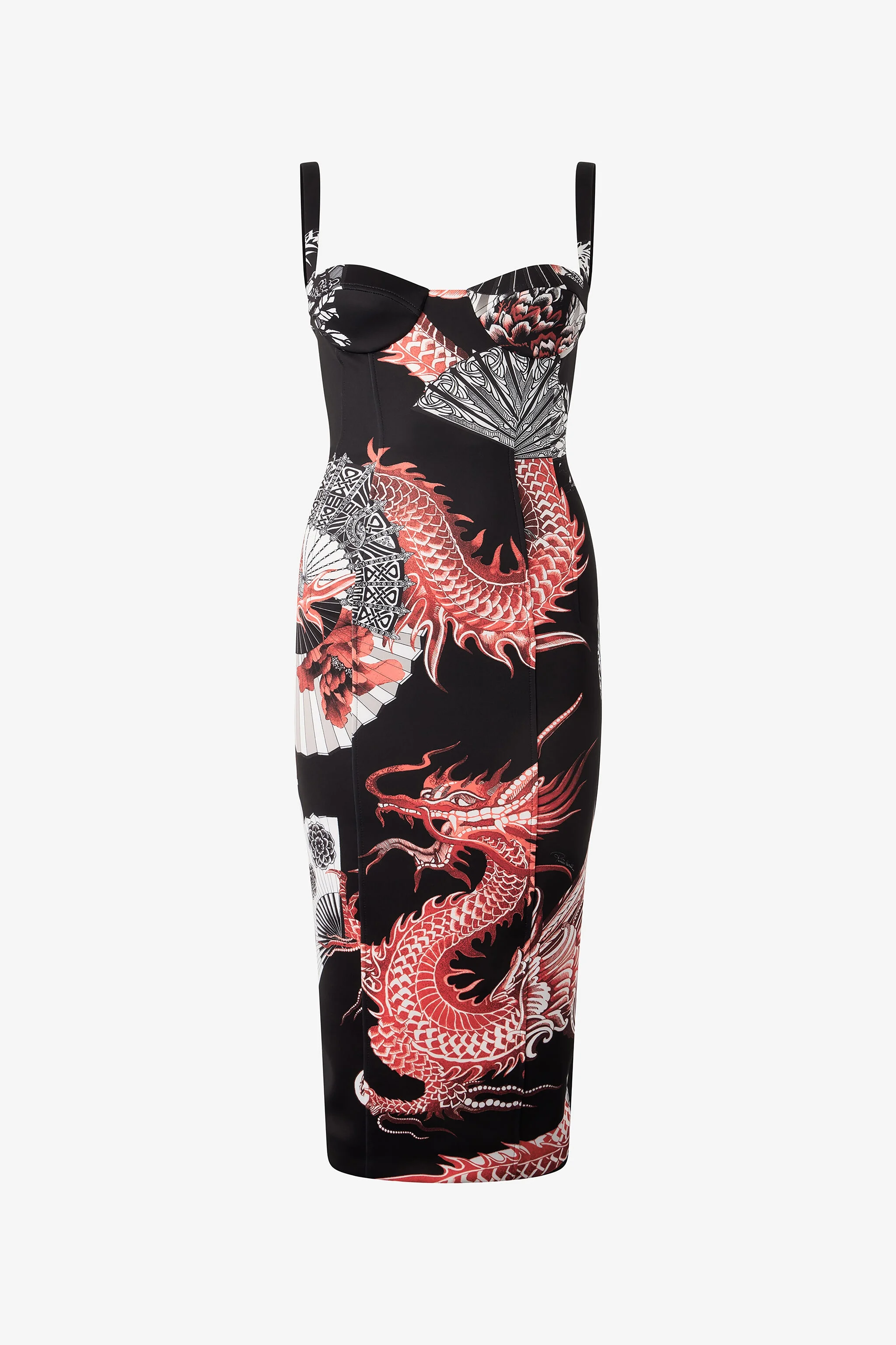 ID: VQT149-JMP75-T0968 The reptile universe, one of the Maison's greatest sources of inspiration, is expressed in this sophisticated midi dress through a legendary kindred creature: a Chinese dragon with fans that swirls over the entire surface of the garment, creating intriguing color contrasts. The sheath dress style also stands out due to the structured detail on the bra-effect decolletage and the back zipper fastening. The back slit and open-back design give it a touch of sensuality. Details - Midi length dress - All-over dragon and fan print - Sheath shape - Bare-shoulder design - Bra-effect decolletage - Back fastening with visible zipper - Discreet back slit
