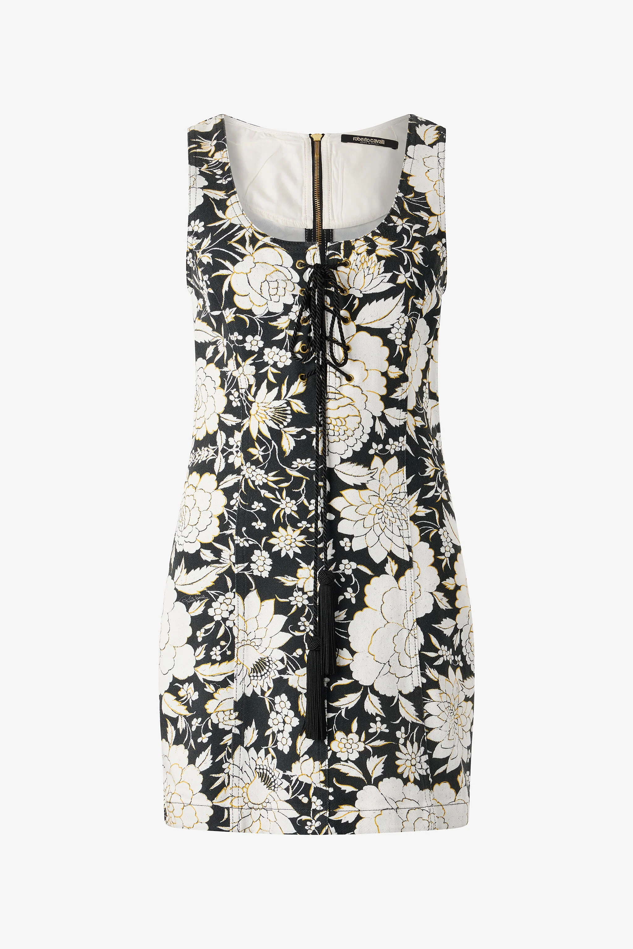 ID: VQJ150-DAP71-D0477 This refined mini dress by Roberto Cavalli features a romantic effect of contrasts, in which the minimalist silhouette is combined with an all-over floral pattern. This style, entirely made in Italy of stretch cotton, is also defined by a square neckline completed by a criss-cross lacing with tassel-finished ends. Details - Stretch cotton mini dress - Sleeveless design with a slim fit - All-over floral print - Square neckline with criss-crossing laces - Back fastening with visible zipper - Logo label inside the neck - Made in Italy