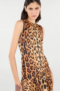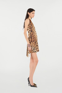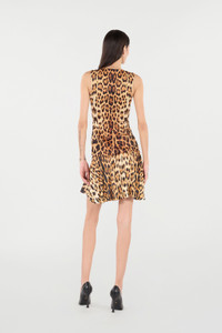 ID: VKT142-JMP73-00504 Animal motifs, one of the most recognizable elements of the Roberto Cavalli universe, are featured in an all-over version on this mini dress with a sleeveless design and an asymmetrical hem. The fitted waist model features a slightly longer soft skirt on the back and the emblematic Jaguar Skin print that extends over the entire surface. Details - Mini dress with asymmetric skirt - All-over Jaguar Skin print - Sleeveless design fitted at the waist - Front fastening with visible zip and branded pull-tab - Logo label on the inner collar - Roberto Cavalli signature within the print - Made in Italy