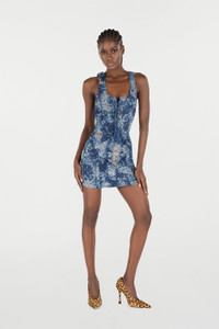 ID: VKJ150-VT012-04564 This sleeveless mini dress by Roberto Cavalli stands out for its fitted cut and the captivating mottled effect created by discoloration and abrasions. The wild spirit of the animal universe, which has always been a source of inspiration for the Maison, is expressed here by an inner lining with Jaguar Skin print complete with the Roberto Cavalli label. The style, made of cotton-blend denim, is also defined by a zip on the back and a square neckline complete with criss-cross lacing with tassel-finished ends. The fitted design highlights the silhouette, while the animal print gives a bold touch to your daytime or evening looks. Details - Cotton-blend denim mini dress - Discoloration and abrasions for an all-over mottled effect - Square neckline with lacing and tassels - Lining with Jaguar Skin print - Roberto Cavalli label on the interior - Back zipper fastening - Sleeveless design - Made in Italy