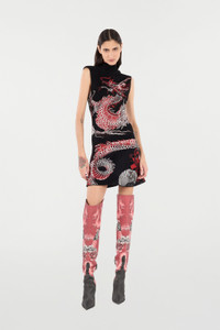 ID: VQM106-MG011-T0968 The reptile universe, one of the Maison's greatest sources of inspiration, is expressed in this mini dress through a legendary kindred creature: a dragon, with fans in a vibrant contrasting tone, that embraces the silhouette. Perfect for those who love comfort without sacrificing a touch of boldness, this style by Roberto Cavalli stands out with a sensual floral pattern that embellishes the back and the classic detail of the stand-up collar. Details - Sleeveless mini dress - Pattern with contrasting dragon, flowers and fans - Fitted shape with slightly flared skirt - Stand-up collar