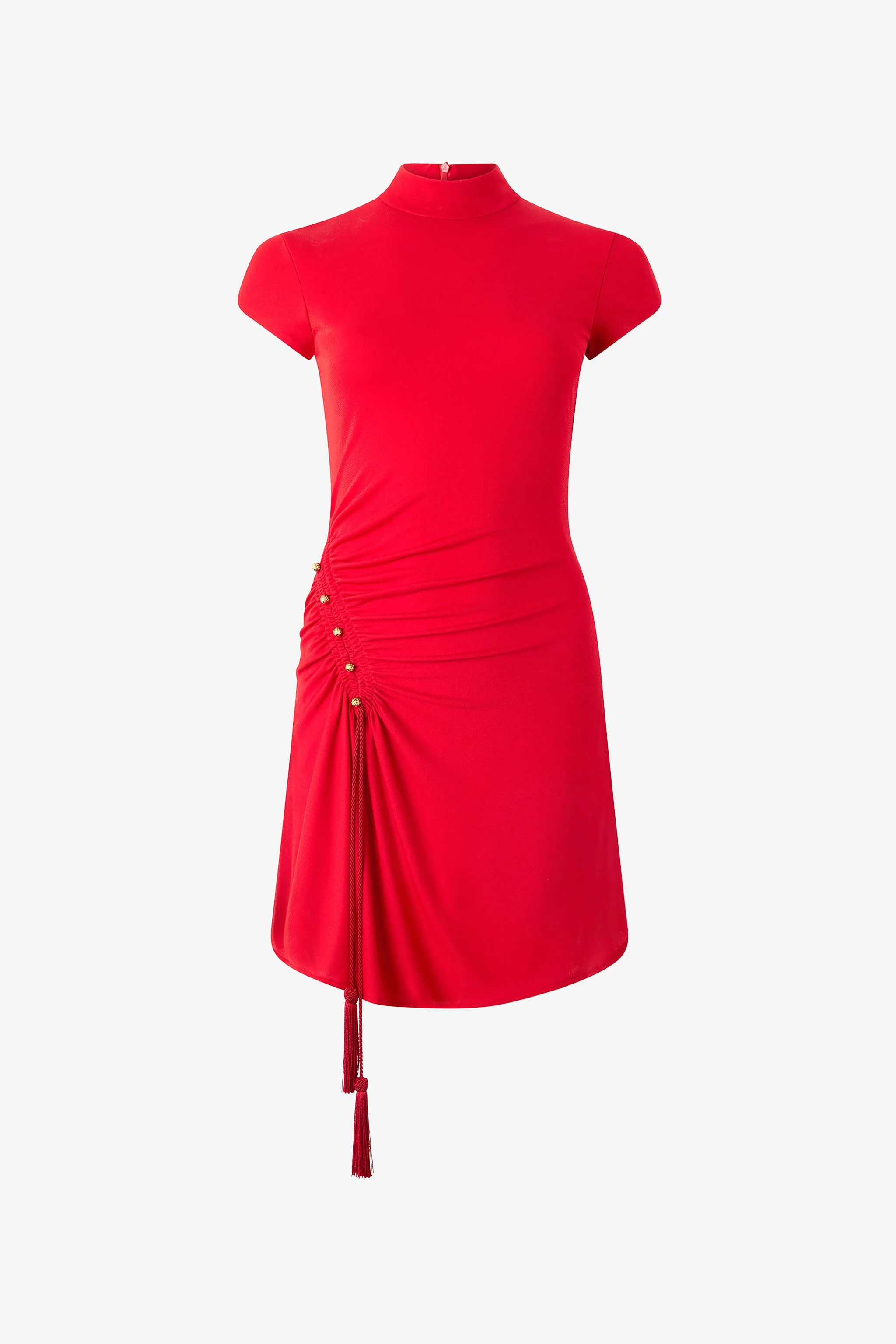 ID: VQT143-JE034-02066 An expression of a refined yet never ordinary style, this mini dress by Roberto Cavalli is brought to life by a ruffled waist detail, enhanced with a radiant row of golden buttons. The subtle sensuality of the fitted cut is brought to the fore by the soft draping created by a drawstring with matching tassel-finished ends. Adding a further touch of sophistication to the garment is the concealed zipper fastening at the back and a classic stand-up collar. Details - Mini dress with gold appliques - Ruched detail that defines the silhouette - Tight fit that loosens at the hem - Diagonal row of decorative buttons - Stand-up collar - Front fastening with concealed zipper