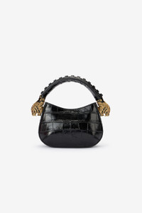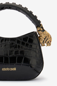 ID: TWB003-PZ975-05051 A true homage to the brand's distinctive style, this mini hobo bag is crafted from genuine leather with crocodile scale-effect embossing and is finished with the signature Roberto Cavalli logo on the front. This accessory is complemented by a top handle with two crystal-studded tiger heads embellishing the ends. Details - Hobo bag that can be carried as a shoulder bag or handbag - Mini size - Top handle with bejeweled tiger heads - Roberto Cavalli logo on the front - Top opening - Printed lining Care & maintenance Leather - Fur:Bos Taurus / Lining:97% Cotton, 3% Elastane