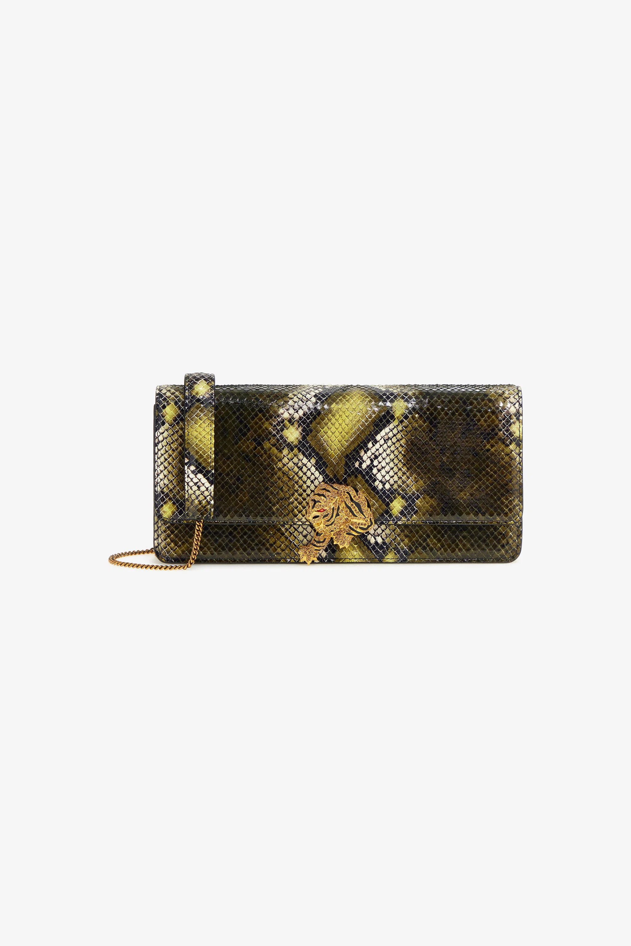 ID: TKB012-PZ02S-D0318 Crafted from leather with a rich python scale-effect print, this rectangular bag is embellished with a crystal-studded tiger flap fastening. This accessory is complemented by a slim chain strap with leather shoulder strap that adds a functional edge. Details - Rectangular shoulder bag - Gold-tone chain strap with leather shoulder strap - Lined interior - Flap with bejewelled tiger and press-stud Care & maintenance Leather - Fur:Bos Taurus / Lining:60% Polyester, 40% Polyurethane