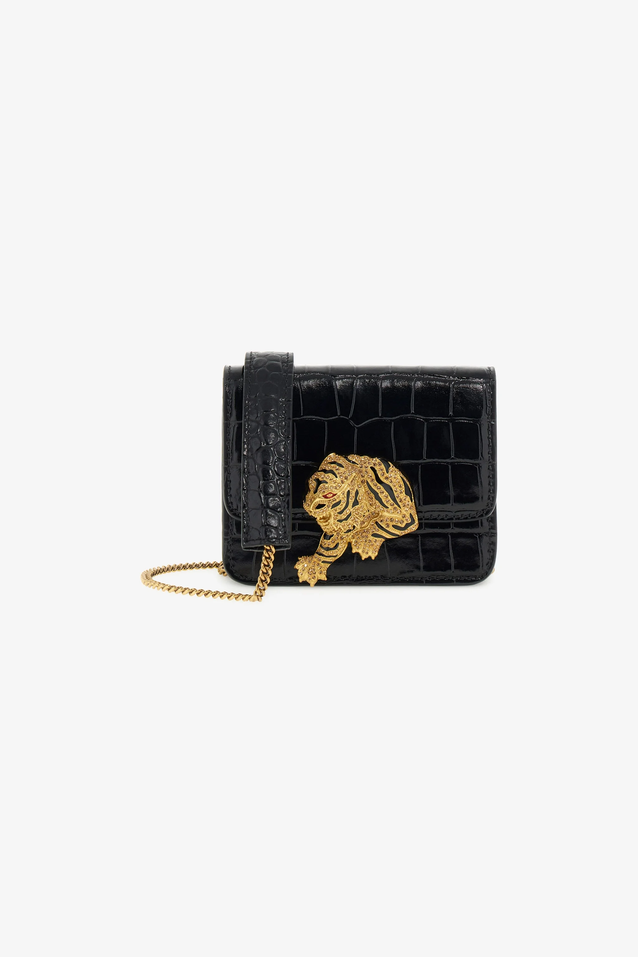 ID: TKB014-PZ975-05051 This mini bag, made of genuine crocodile scale-effect leather, celebrates the DNA of the Roberto Cavalli Maison thanks to the logo on the back and the crystal-studded tiger embellishing the flap fastening. A slim chain strap with leather shoulder strap adds a functional touch to the accessory, without sacrificing elegance. Details - Measures 13x10,5x5,5 cm Care & maintenance Leather - Fur:Bos Taurus / Lining:56% Polyurethane, 44% Polyester