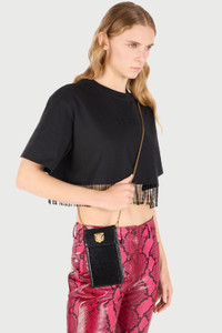 ID: UKA005-PZ579-D0007 A snake scale-effect texture and crystal-studded tiger head stands out on the front: this is how Roberto Cavalli pays tribute to its distinctive style in this mini bag with a rectangular design, where the functional edge is provided by the removable chain strap with leather top strap. The accessory is finished with the signature Roberto Cavalli logo on the back. Details - Snake scale-effect leather mini Roar bag - Bejeweled tiger head - Lined - Magnetic flap fastening - Clasp-removable chain strap with leather shoulder pad - Roberto Cavalli logo on the back Care & maintenance Leather - Fur:Aegagrus Hircus / Lining:60% Polyester, 40% Polyurethane