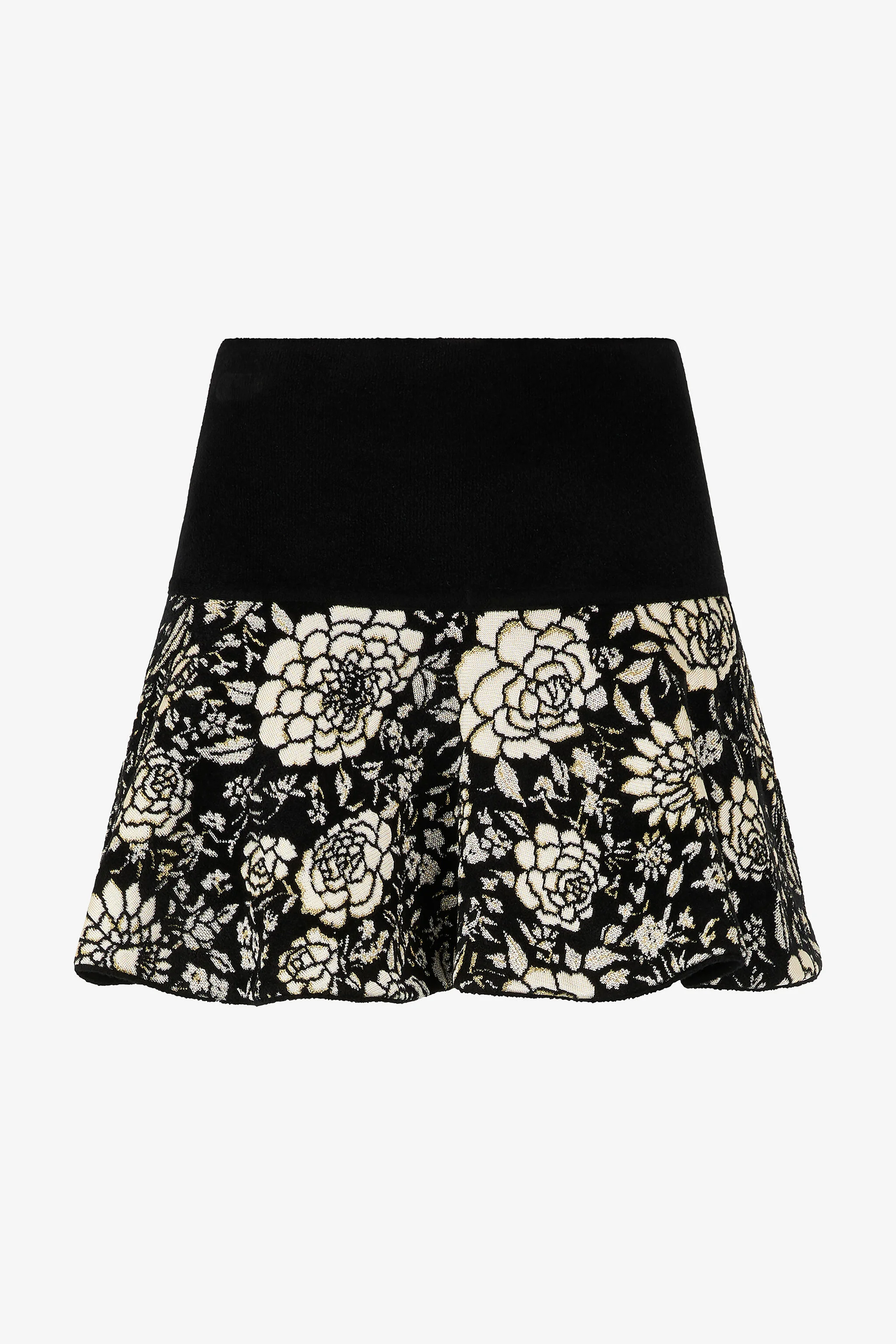 ID: VQM307-MI014-D0477 Express your romantic spirit with this elegant knitted miniskirt by Roberto Cavalli. The garment features a sumptuous contrasting floral jacquard pattern, and is complemented by a lightweight ruffled skirt topped by a solid-color elasticated upper band. Details - Knitted miniskirt - All-over jacquard floral pattern - Solid-colored elasticated band - Flounced detailing on hem - Tight cut that loosens towards the hem