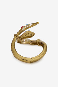 ID: VKG006-AM081-T0359 Roberto Cavalli translates the elegance of the reptile universe into a precious snake-shaped bangle featuring a lightly hammered workmanship all over the body and the combination of bright crystals and stones in different shapes and colors. The accessory has an open design that makes it ideal for curving around the arm. Details - Snake-shaped bangle - Body with a lightly hammered effect - Elements with colored stones and crystals - Double spring opening