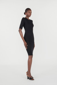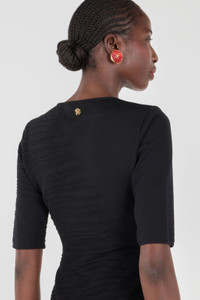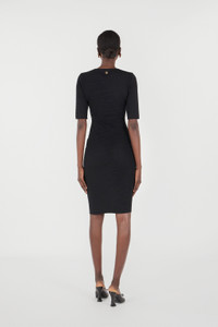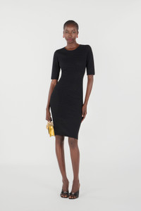 ID: UKM101-MQ014-05051 This refined and understated wool midi dress could not do without the distinctive style of Roberto Cavalli, here expressed in the form of the perforated White Tigress motif all over the garment, adding a touch of hidden audacity. Details - Wool midi dress - Crew neck - Half sleeves - Perforated White Tigress pattern - Metallic RC monogram on the back - Roberto Cavalli label on the inside collar