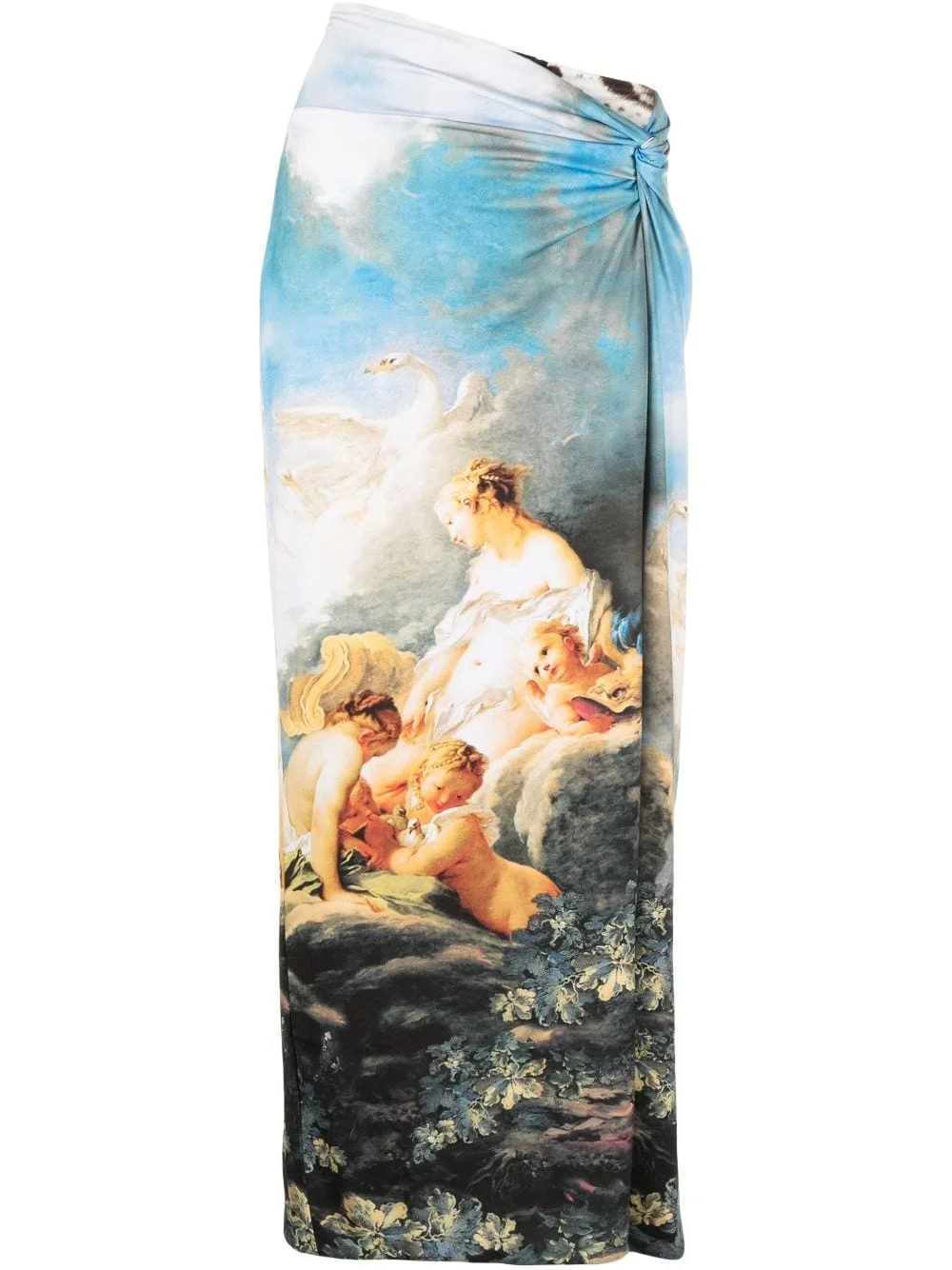Painting-print asymmetric skirt Highlights - Sky blue/multicolour - Stretch-design - Asymmetric design - Painterly print - Animal print - Twist detailing - Reversible - Side slit - Mid-length Made in Italy Composition Polyamide 90%, Spandex/Elastane 10% SIZE & FIT Model measurements Height 5 ft 11 in(1.8 m) Bust/Chest 31.49 in(80 cm) Hips 36.22 in(92 cm) Waist 25.59 in(65 cm) FittingInformation This midi-length skirt is intended to be worn high on the waist Made from a midweight stretch fabric, this piece offers elasticity and flexibility when worn This piece fits true to size – take your usual size Washing instructions Dry Clean Only