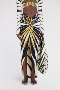 ID: TKW016-HVM33-01080 Evoking the radiance of the summer sun, the Ray of Gold sarong captures the essence of poolside glamour. The abstract print, featuring bold strokes of black, white, and gold, creates a dynamic and luxurious visual effect. Its wrap design with a central knot flatters the silhouette, offering elegant and versatile coverage for warmer days. Details - Versatile sarong design - Exclusive Ray of Gold print - Stretch fabric for optimal comfort - Draped front knot detail - Adjustable wrap-around style - Ideal for the beach, poolside, or exclusive resorts - Perfect for pairing with coordinating swimwear from the collection - Made in Italy Care & maintenance External fabric:72% Polybutylene terephthalate, 28% Elastane