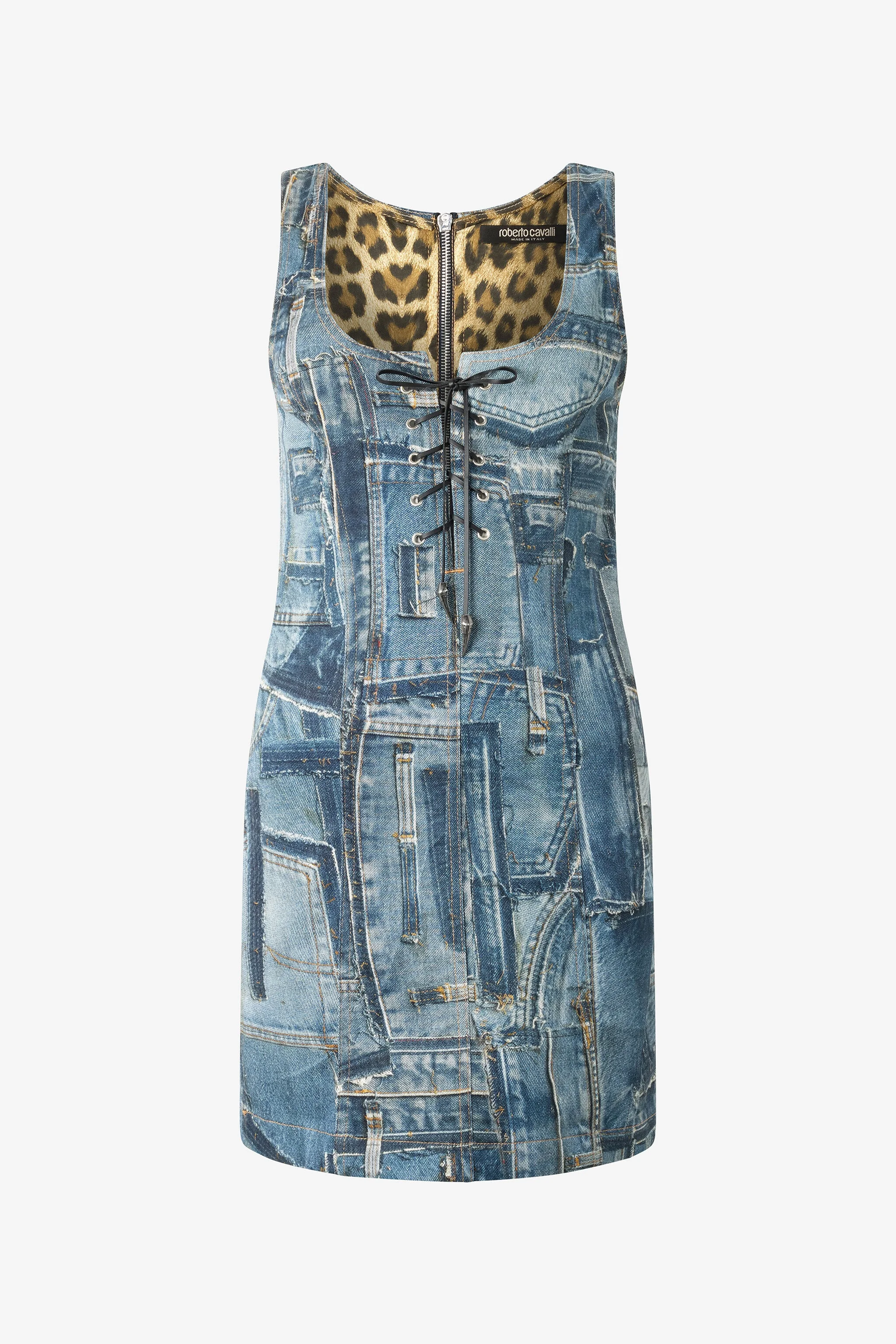 ID: UWJ150-DS001-04564 The timeless character of the denim fabric is reinterpreted by Roberto Cavalli in this sleeveless dress with a fresh and contemporary design, characterized by an unprecedented patchwork given by the combination of inserts in stretch cotton denim with different shades and finishes. The model is also defined by a deep square neckline on the front, completed by a corset-style lacing with metal tips in the shape of the iconic Fang tiger tooth, and by the inner lining that reveals the unmistakable Jaguar Skin print, a tribute to the Maison's passion for animal prints. Details - Short dress with patchwork denim inserts - Sleeveless design - Slightly squared neckline - Corset-style front fastening with Fang metal tips - Loop details - Zip closure at the back - Fang tiger tooth-shaped zipper pull - Inner cotton lining with Jaguar Skin print - Roberto Cavalli label on the inside of the collar - Made in Italy Care & maintenance External fabric:98% Cotton, 2% Elastane / Lining:100% Cotton