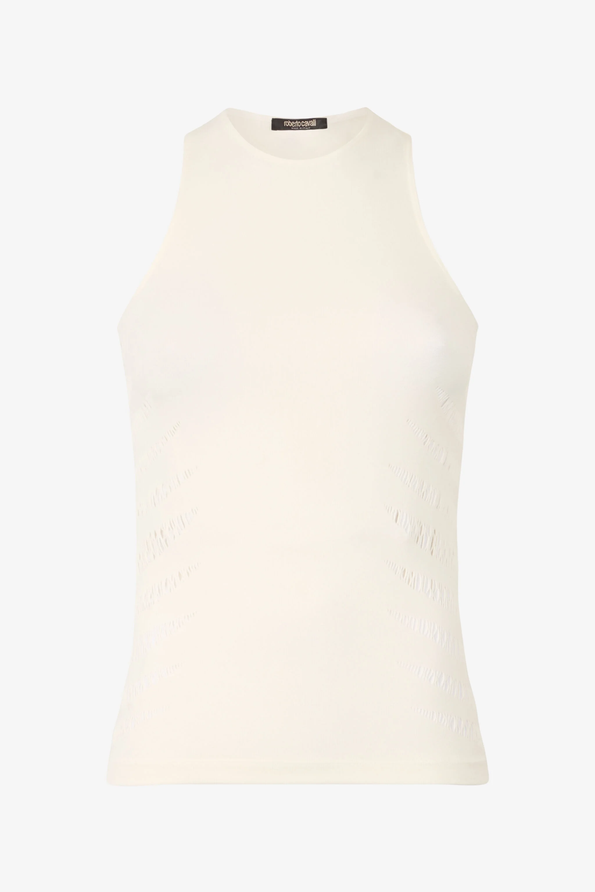 ID: UKT613-MA001-09088 Details - Sleeveless tank top with halter neckline - Crew neck - Laser-cut Zebra pattern - Roberto Cavalli label inside the collar - Made in Italy Care & maintenance External fabric:83% Polybutylene terephthalate, 17% Elastane